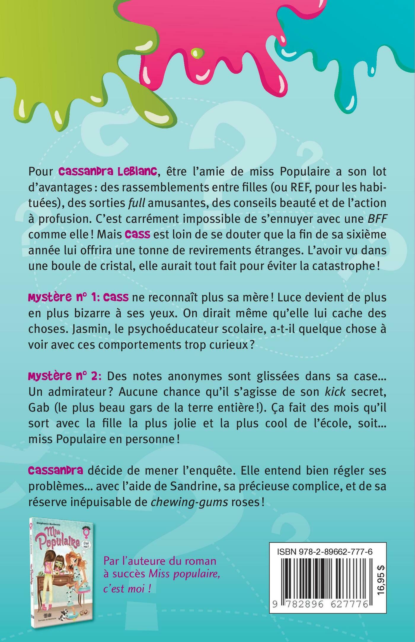 Pour Cassandra Leblanc, être l'amie de miss Populaire a son lot d'avantages : des rassemblements entre filles (ou REF, pour les habituées), des sorties full amusantes, des conseils beauté et de l'action à profusion. C'est carrément impossible de s'ennuyer avec une BFF comme elle ! Mais Cass est loin de se douter que la fin de sa sixième année lui offrira une tonne de revirements étranges. L'avoir vu dans une boule de cristal, elle aurait tout fait pour éviter la catastrophe !Mystère no 1 : Cass ne reconnaît plus sa mère ! Luce devient de plus en plus bizarre à ses yeux. On dirait même qu'elle lui cache des choses. Jasmin, le psychoéducateur scolaire, a-t-il quelque chose à voir avec ces comportements trop curieux ?Mystère no 2 : Des notes anonymes sont glissées dans sa case… Un admirateur ? Aucune chance qu'il s'agisse de son kick secret, Gab (le plus beau gars de la terre entière !). Ça fait des mois qu'il sort avec la fille la plus jolie et la plus cool de l'école, soit… miss Populaire en personne !Cassandra décide de mener l'enquête. Elle entend bien régler ses problèmes… avec l'aide de Sandrine, sa précieuse complice, et de sa réserve inépuisable de chewing-gums roses !