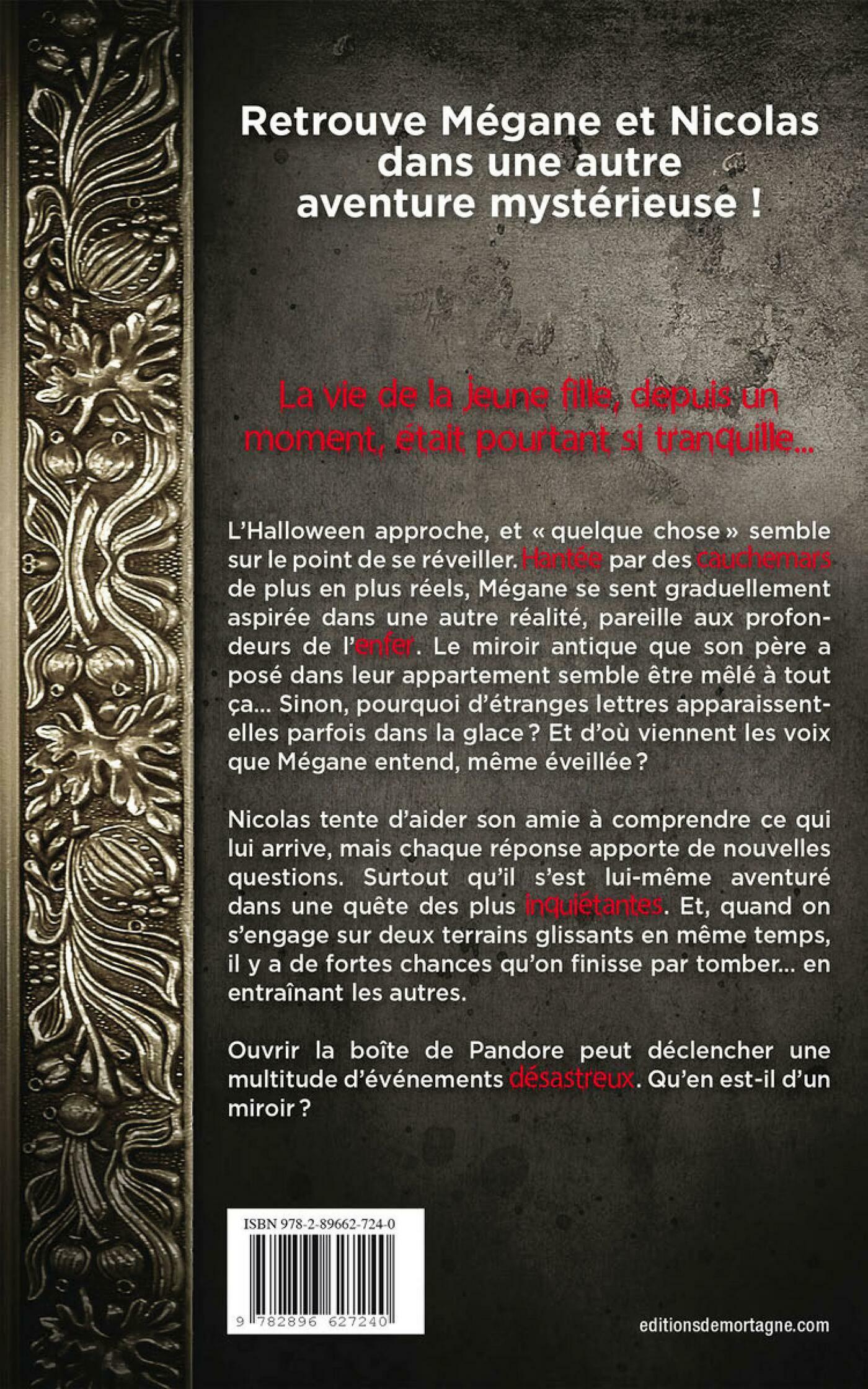 La vie de Mégane, depuis un moment, était pourtant si tranquille… L'Halloween approche, et « quelque chose » semble sur le point de se réveiller. Hantée par des cauchemars de plus en plus réels, Mégane se sent graduellement aspirée dans une autre réalité, pareille aux profondeurs de l'enfer. Le miroir antique que son père a posé dans leur appartement semble être mêlé à tout ça… Sinon, pourquoi d'étranges lettres apparaissent-elles parfois dans la glace ? Et d'où viennent les voix que Mégane entend, même éveillée ? Nicolas tente d'aider son amie à comprendre ce qui lui arrive, mais chaque réponse apporte de nouvelles questions. Surtout qu'il s'est lui-même aventuré dans une quête des plus inquiétantes. Et, quand on s'engage sur deux terrains glissants en même temps, il y a de fortes chances qu'on finisse par tomber… en entraînant les autres.Ouvrir la boîte de Pandore peut déclencher une multitude d'événements désastreux. Qu'en est-il d'un miroir ?