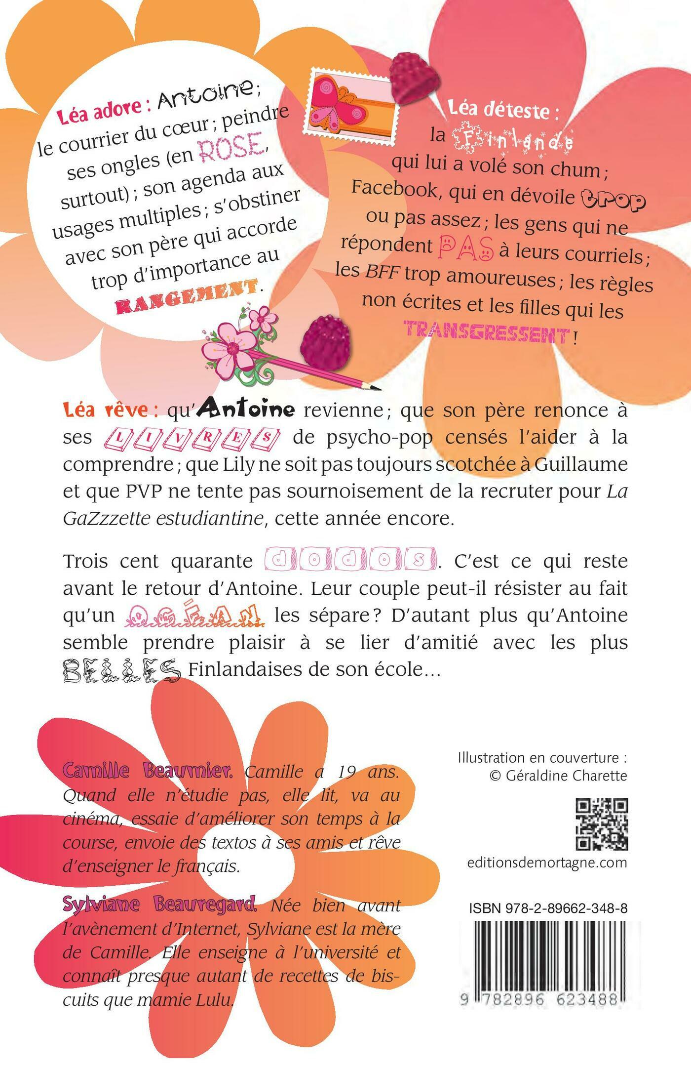 Léa adore : Antoine; le courrier du cœur ; peindre ses ongles (en rose, surtout); son agenda aux usages multiples ; s’obstiner avec son père qui accorde trop d’importance au rangement.Léa déteste : la Finlande qui lui a volé son chum ; Facebook, qui en dévoile trop ou pas assez ; les gens qui ne répondent pas à leurs courriels; les BFF trop amoureuses ; les règles non écrites et les filles qui les transgressent !Léa rêve : qu’Antoine revienne ; que son père renonce à ses livres de psycho-pop censés l’aider à la comprendre ; que Lily ne soit pas toujours scotchée à Guillaume et que PVP ne tente pas sournoisement de la recruter pour La GaZzzette estudiantine, cette année encore.Trois cent quarante dodos. C’est ce qui reste avant le retour d’Antoine. Leur couple peut-il résister au fait qu’un océan les sépare? D’autant plus qu’Antoine semble prendre plaisir à se lier d’amitié avec les plus belles Finlandaises de son école…