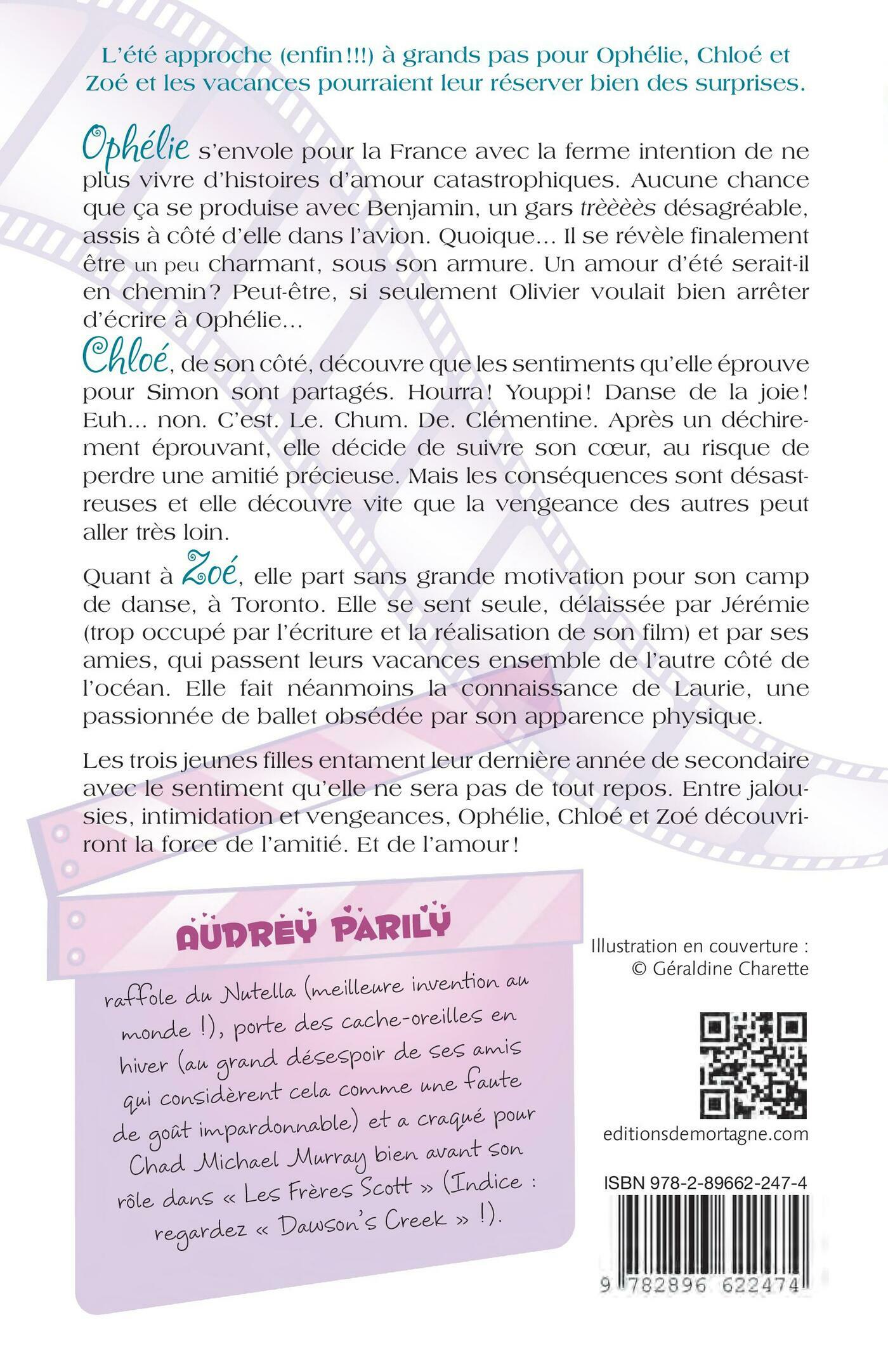 L'été approche (enfin!!!) à grands pas pour Ophélie, Chloé et Zoé, mais les vacances pourraient leur réserver bien des surprises.Ophélie s'envole pour la France avec la ferme intention de ne plus vivre d'histoires d'amour catastrophiques. Aucune chance que ça se produise avec Benjamin, un gars trèèèès désagréable, assis à côté d'elle dans l'avion. Quoique... Il se révèle finalement un peu charmant, sous son armure. Un amour d'été serait-il en chemin? Peut-être, si seulement Olivier voulait bien arrêter d'écrire à Ophélie...Chloé, de son côté, découvre que les sentiments qu'elle éprouve pour Simon sont partagés. Hourra! Youppi! Danse de la joie! Euh... non. C'est. Le. Chum. De. Clémentine. Après un dilemme éprouvant, elle décide de suivre son coeur, au risque de perdre une amitié précieuse. Mais les conséquences sont désastreuses et elle découvre que la vengeance des autres peut aller très loin.Quant à Zoé, elle part sans grande motivation pour son camp de danse, à Toronto. Elle se sent seule, délaissée par Jérémie (trop occupé par l'écriture et la réalisation de son film) et par ses amies, qui passent leurs vacances ensemble de l'autre côté de l'océan. Elle fait néanmoins la connaissance de Laurie, une passionnée de ballet obsédée par son apparence physique.Les trois jeunes filles entament leur dernière année de secondaire avec le sentiment qu'elle ne sera pas de tout repos. Entre jalousies, intimidation et vengeances, Ophélie, Chloé et Zoé découvriront la force de l'amitié. Et de l'amour!