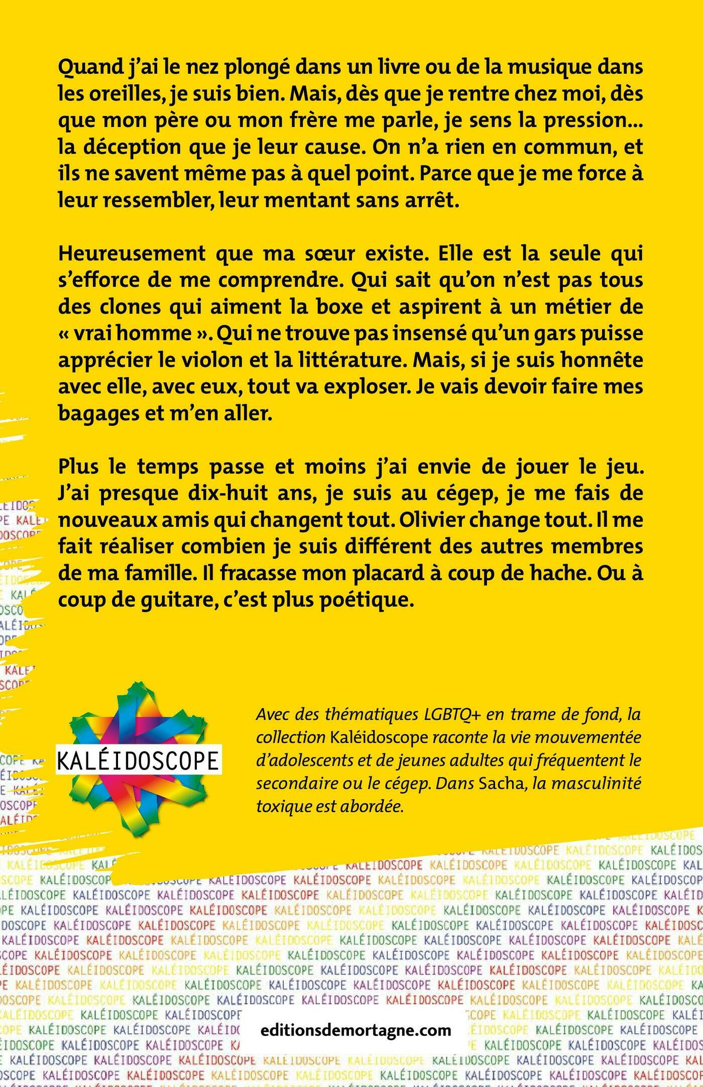 Quand j’ai le nez plongé dans un livre ou de la musique dans les oreilles, je suis bien. Mais, dès que je rentre chez moi, dès que mon père ou mon frère me parle, je sens la pression… la déception que je leur cause. On n’a rien en commun, et ils ne savent même pas à quel point. Parce que je me force à leur ressembler, leur mentant sans arrêt. Heureusement que ma sœur existe. Elle est la seule qui s’efforce de me comprendre. Qui sait qu’on n’est pas tous des clones qui aiment la boxe et aspirent à un métier de « vrai homme ». Qui ne trouve pas insensé qu’un gars puisse apprécier le violon et la littérature. Mais, si je suis honnête avec elle, avec eux, tout va exploser. Je vais devoir faire mes bagages et m’en aller.Plus le temps passe et moins j’ai envie de jouer le jeu. J’ai presque dix-huit ans, je suis au cégep, je me fais de nouveaux amis qui changent tout. Olivier change tout. Il me fait réaliser combien je suis différent des autres membres de ma famille. Il fracasse mon placard à coup de hache. Ou à coup de guitare, c’est plus poétique.Avec des thématiques LGBTQ+ en trame de fond, la collection Kaléidoscope raconte la vie mouvementée d’adolescents et de jeunes adultes qui fréquentent le secondaire ou le cégep. Dans Sacha, la masculinité toxique est abordée.