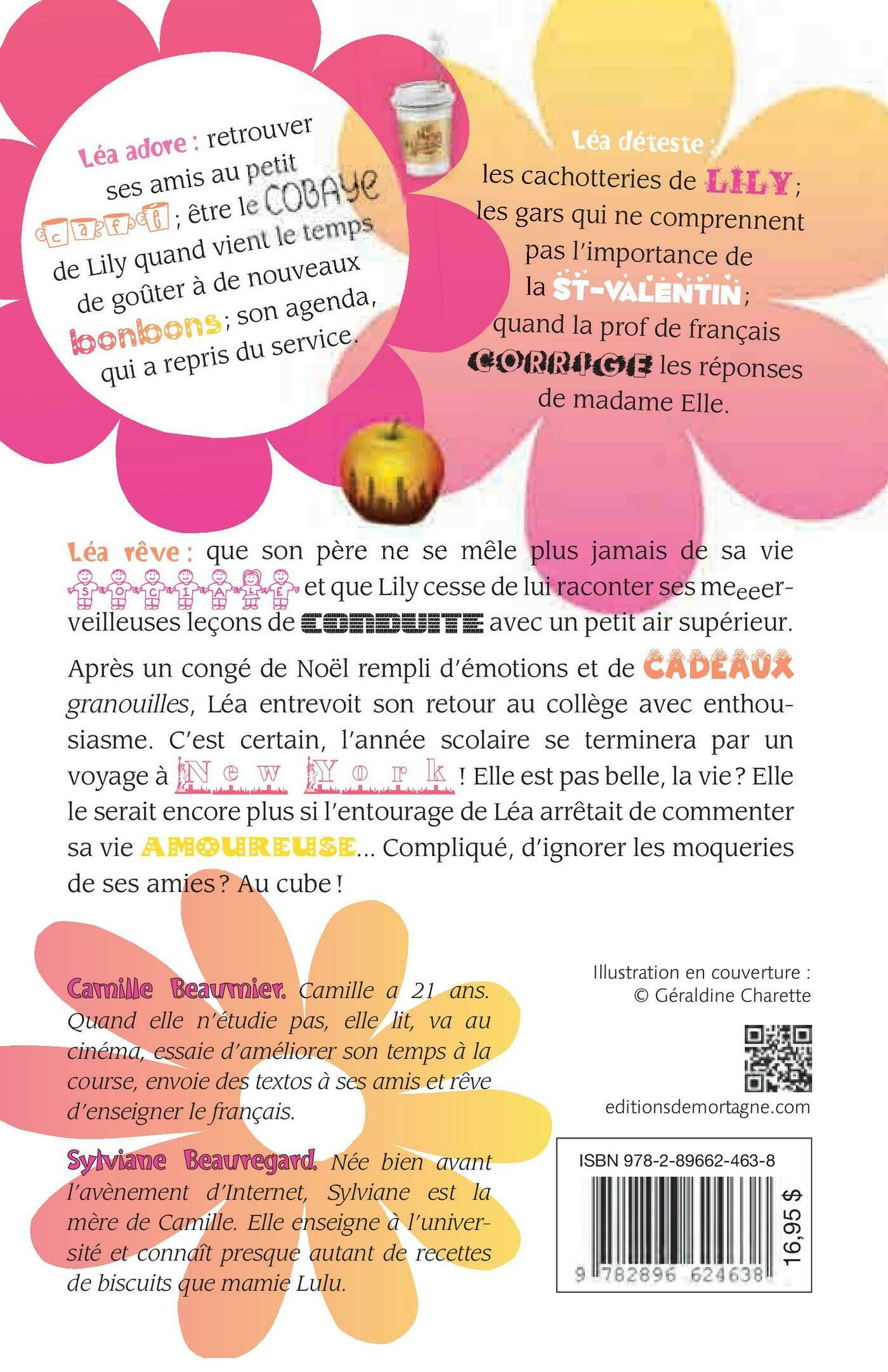 Léa adore : retrouver ses amis au petit café ; être le cobaye de Lily quand vient le temps de goûter à de nouveaux bonbons ; son agenda, qui a repris du service.Léa déteste : les cachotteries de Lily ; les gars qui ne comprennent pas l’importance de la St-Valentin ; quand la prof de français corrige les réponses de madame Elle.Léa rêve : que son père ne se mêle plus jamais de sa vie sociale et que Lily cesse de lui raconter ses meeeerveilleuses leçons de conduite avec un petit air supérieur.Après un congé de Noël rempli d’émotions et de cadeaux granouilles, Léa entrevoit son retour au collège avec enthousiasme. C’est certain, l’année scolaire se terminera par un voyage à New York ! Elle est pas belle, la vie ? Elle le serait encore plus si l’entourage de Léa arrêtait de commenter sa vie amoureuse… Compliqué, d’ignorer les moqueries de ses amies ? Au cube !