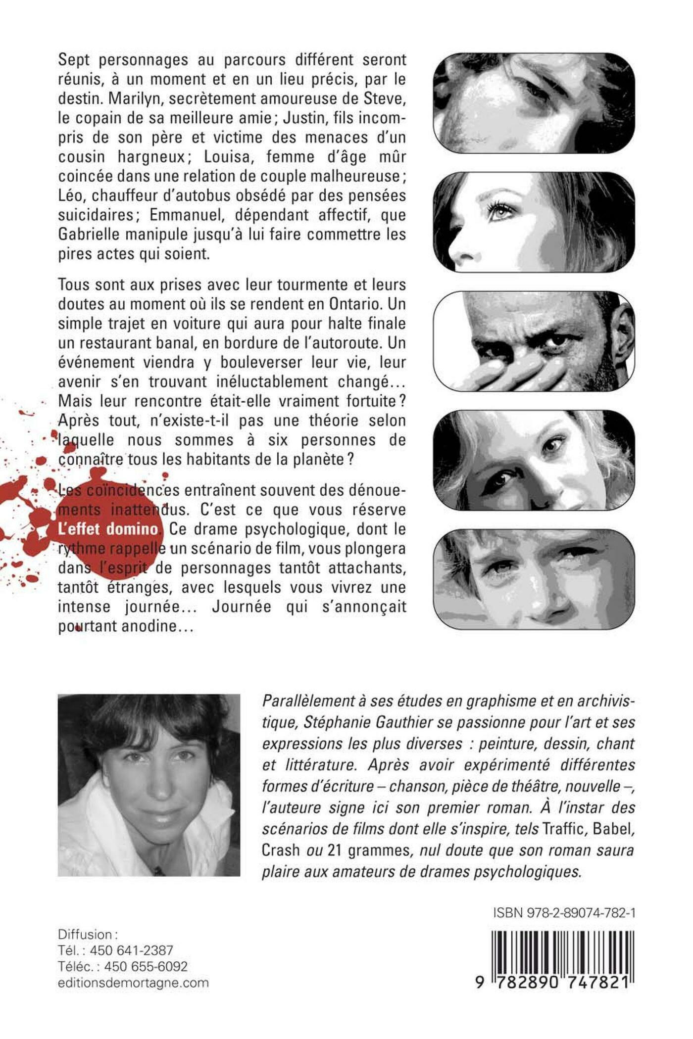 Sept personnages au parcours différent seront réunis, à un moment et en un lieu précis, par le destin. Marilyn, secrètement amoureuse de Steve, le copain de sa meilleure amie ; Justin, fils incompris de son père et victime des menaces d'un cousin hargneux ; Louisa, femme d'âge mûr coincée dans une relation de couple malheureuse ; Léo, chauffeur d'autobus obsédé par des pensées suicidaires ; Emmanuel, dépendant affectif, que Gabrielle manipule jusqu'à lui faire commettre les pires actes qui soient. Tous sont aux prises avec leur tourmente et leurs doutes au moment où ils se rendent en Ontario. Un simple trajet en voiture qui aura pour halte finale un restaurant banal, en bordure de l'autoroute. Un événement viendra y bouleverser leur vie, leur avenir s'en trouvant inéluctablement changé... Mais leur rencontre était-elle vraiment fortuite? Après tout, n'existe-t-il pas une théorie selon laquelle nous sommes à six personnes de connaître tous les habitants de la planète? Les coïncidences entraînent souvent des dénouements inattendus. C'est ce que vous réserve L'effet domino. Ce drame psychologique, dont le rythme rappelle un scénario de film, vous plongera dans l'esprit de personnages tantôt attachants, tantôt étranges, avec lesquels vous vivrez une intense journée... Journée qui s'annonçait pourtant anodine...
