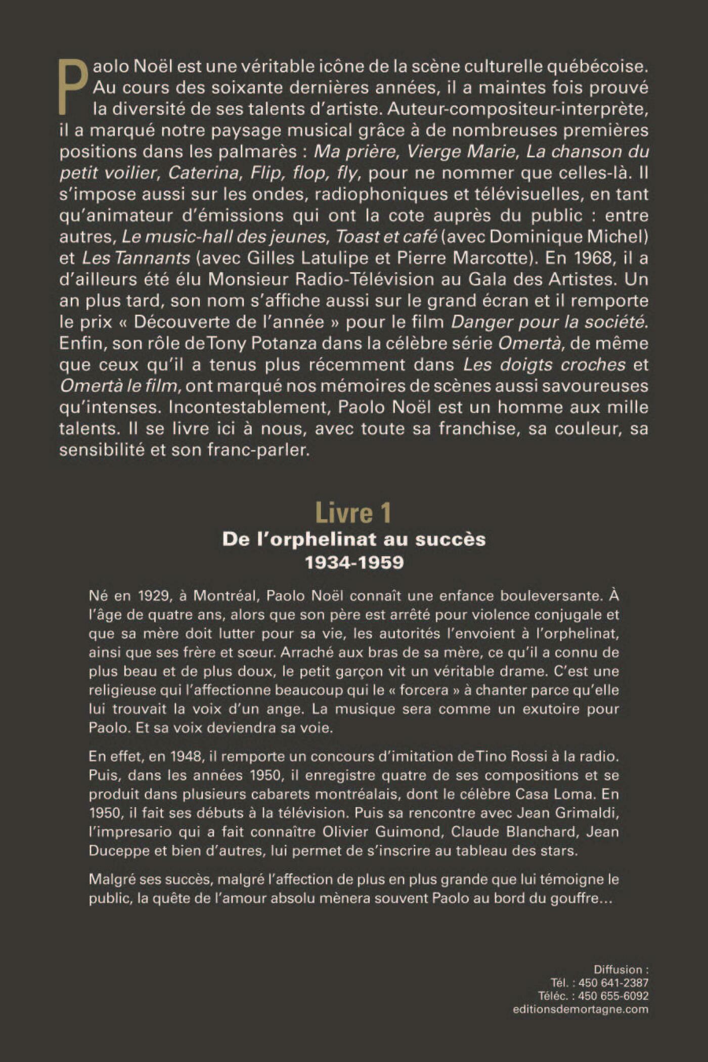 "Né en 1929, à Montréal, Paolo Noël connaît une enfance bouleversante. A l'âge de quatre ans, alors que son père est arrêté pour violence conjugale et que sa mère doit lutter pour sa vie, les autorités l'envoient à l'orphelinat, ainsi que ses frère et soeur. Arraché à ce qu'il a connu de plus beau et de plus doux, le petit garçon vit un véritable drame. C'est une religieuse qui l'affectionne beaucoup qui le « forcera » à chanter parce qu'elle lui trouvait la voix d'un ange. La musique sera comme un exutoire pour Paolo. Et sa voix deviendra sa voie. En effet, en 1948, il remporte un concours d'imitation de Tino Rossi à la radio. Puis, dans les années 1950, il enregistre quatre de ses compositions et se produit dans plusieurs cabarets montréalais, dont le célèbre Casa Loma. En 1950, il fait ses débuts à la télévision. Puis sa rencontre avec Jean Grimaldi, l'impresario qui a fait connaître Olivier Guimond, Claude Blanchard, Jean Duceppe et bien d'autres lui permet de s'inscrire au tableau des stars. Malgré ses succès, malgré l'affection de plus en plus grande que lui témoigne le public, la quête de l'amour absolu mènera souvent Paolo au bord du gouffre…"