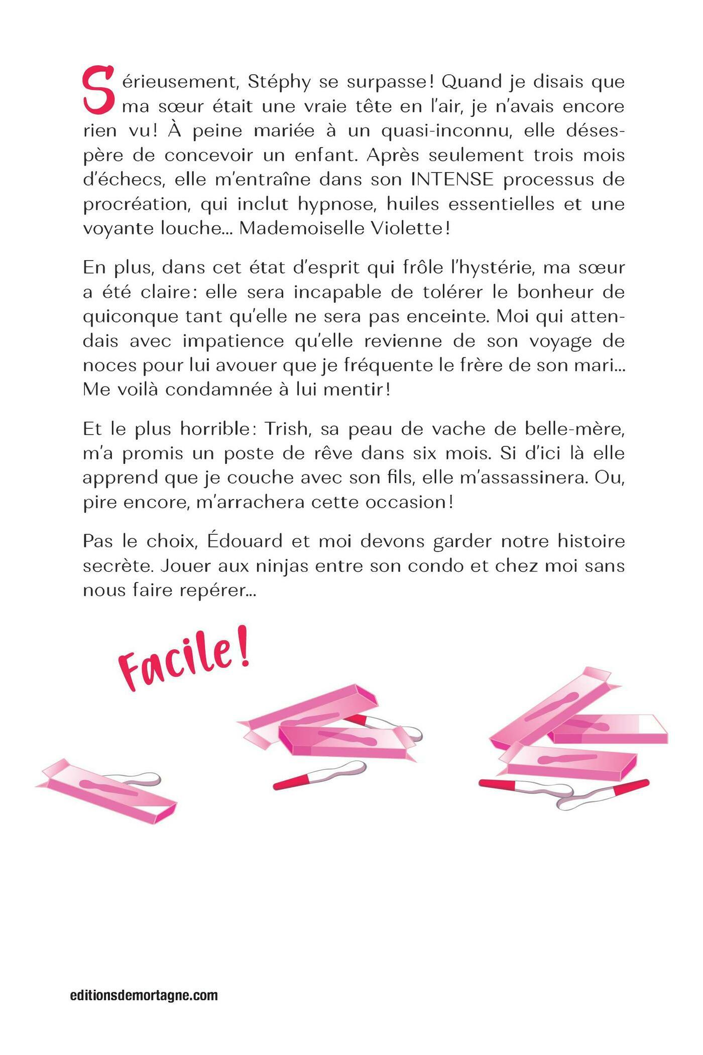 Sérieusement, Stéphy se surpasse ! Quand je disais que ma sœur était une vraie tête en l’air, je n’avais encore rien vu ! À peine mariée à un quasi-inconnu, elle désespère de concevoir un enfant. Après seulement trois mois d’échecs, elle m’entraîne dans son INTENSE processus de procréation, qui inclut hypnose, huiles essentielles et une voyante louche… Mademoiselle Violette !En plus, dans cet état d’esprit qui frôle l’hystérie, ma sœur a été claire : elle sera incapable de tolérer le bonheur de quiconque tant qu’elle ne sera pas enceinte. Moi qui attendais avec impatience qu’elle revienne de son voyage de noces pour lui avouer que je fréquente le frère de son mari… Me voilà condamnée à lui mentir !Et le plus horrible : Trish, sa peau de vache de belle-mère, m’a promis un poste de rêve dans six mois. Si d’ici là elle apprend que je couche avec son fils, elle m’assassinera. Ou, pire encore, m’arrachera cette occasion !Pas le choix, Édouard et moi devons garder notre histoire secrète. Jouer aux ninjas entre son condo et chez moi sans nous faire repérer… Facile !