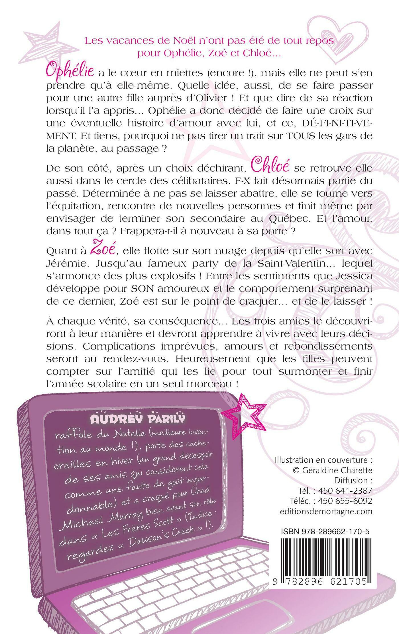 Les vacances de Noël n'ont pas été de tout reposPour Ophélie, Zoé et Chloé…Ophélie a le coeur en miettes (encore!), mais elle ne peut s'en prendre qu'à elle-même. Quelle idée, aussi, de se faire passer pour une autre fille auprès d'Olivier ! Et que dire de sa réaction lorsqu'il l'a appris… Ophélie a donc décidé de faire une croix sur une éventuelle histoire d'amour avec lui, et ce DE-FI-NI-TI-VE-MENT. Et tiens, pourquoi ne pas tirer un trait sur TOUS les gars de la planète, au passage ?De son côté, après un choix déchirant, Chloé se retrouve elle aussi dans le cercle des célibataires. F-X fait désormais partie du passé. Déterminée à ne pas se laisser abattre, elle se tourne vers l'équitation, rencontre de nouvelles personnes en finit même par envisager de terminer son secondaire au Québec. Et l'amour dans tout ça ? Frappera-t-il à nouveau à sa porte ?Quand à Zoé, elle flotte sur un nuage depuis qu'elle sort avec Jérémie. Jusqu'au fameux party de la Saint-Valentin… lequel s'annonce des plus explosifs ! Entre les sentiments que Jessica développe pour SON amoureux et le comportement surprenant de ce dernier, Zoé est sur le point de craquer… et de le laisser ! A chaque vérité, sa conséquence… les trois amies le découvriront à leur manière et devront apprendre à vivre avec leurs décisions. Complications imprévues, amours et rebondissements seront au rendez-vous. Heureusement que les filles peuvent compter sur l'amitié qui les lie pour tout surmonter et finir l'année scolaire en un seul morceau !
