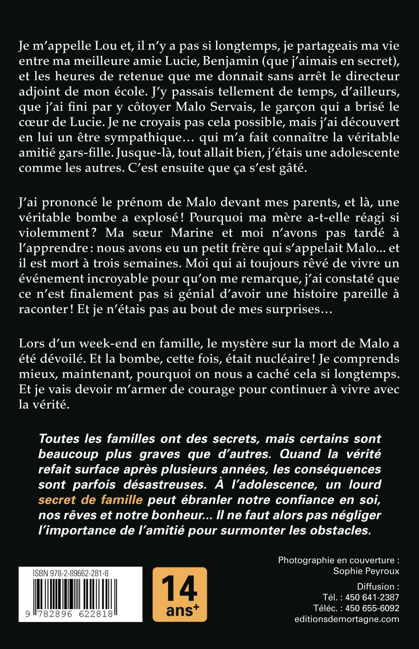 Je m'appelle Lou et, il n'y a pas si longtemps, je partageais ma vie entre ma meilleure amie Lucie, Benjamin (que j'aimais en secret), et les heures de retenue que me donnait sans arrêt le directeur adjoint de mon école. J'y passais tellement de temps, d'ailleurs, que j'ai fini par y côtoyer Malo Servais, le garçon qui a brisé le coeur de Lucie. Je ne croyais pas cela possible, mais j'ai découvert en lui un être sympathique... qui m'a fait connaître la véritable amitié gars-fille. Jusque-là, tout allait bien, j'étais une adolescente comme les autres. C'est ensuite que ça s'est gâté. J'ai prononcé le prénom de Malo devant mes parents, et là, une véritable bombe a explosé! Pourquoi ma mère a-t-elle réagi si violemment? Ma soeur Marine et moi n'avons pas tardé à l'apprendre: nous avons eu un petit frère qui s'appelait Malo... et il est mort à trois semaines. Moi qui ai toujours rêvé de vivre un événement incroyable pour qu'on me remarque, j'ai constaté que ce n'est finalement pas si génial d'avoir une histoire pareille à raconter! Et je n'étais pas au bout de mes surprises... Lors d'un week-end en famille, le mystère sur la mort de Malo a été dévoilé. Et la bombe, cette fois, était nucléaire! Je comprends mieux, maintenant, pourquoi on nous caché cela si longtemps. Et je vais devoir m'armer de courage pour continuer à vivre avec la vérité.Toutes les familles ont des secrets, mais certains sont beaucoup plus graves que d’autres. Quand la vérité refait surface après plusieurs années, les conséquences sont parfois désastreuses. À l’adolescence, un lourd secret de famille peut ébranler notre confiance en soi, nos rêves et notre bonheur… Il ne faut alors pas négliger l’importance de l’amitié pour surmonter les obstacles.