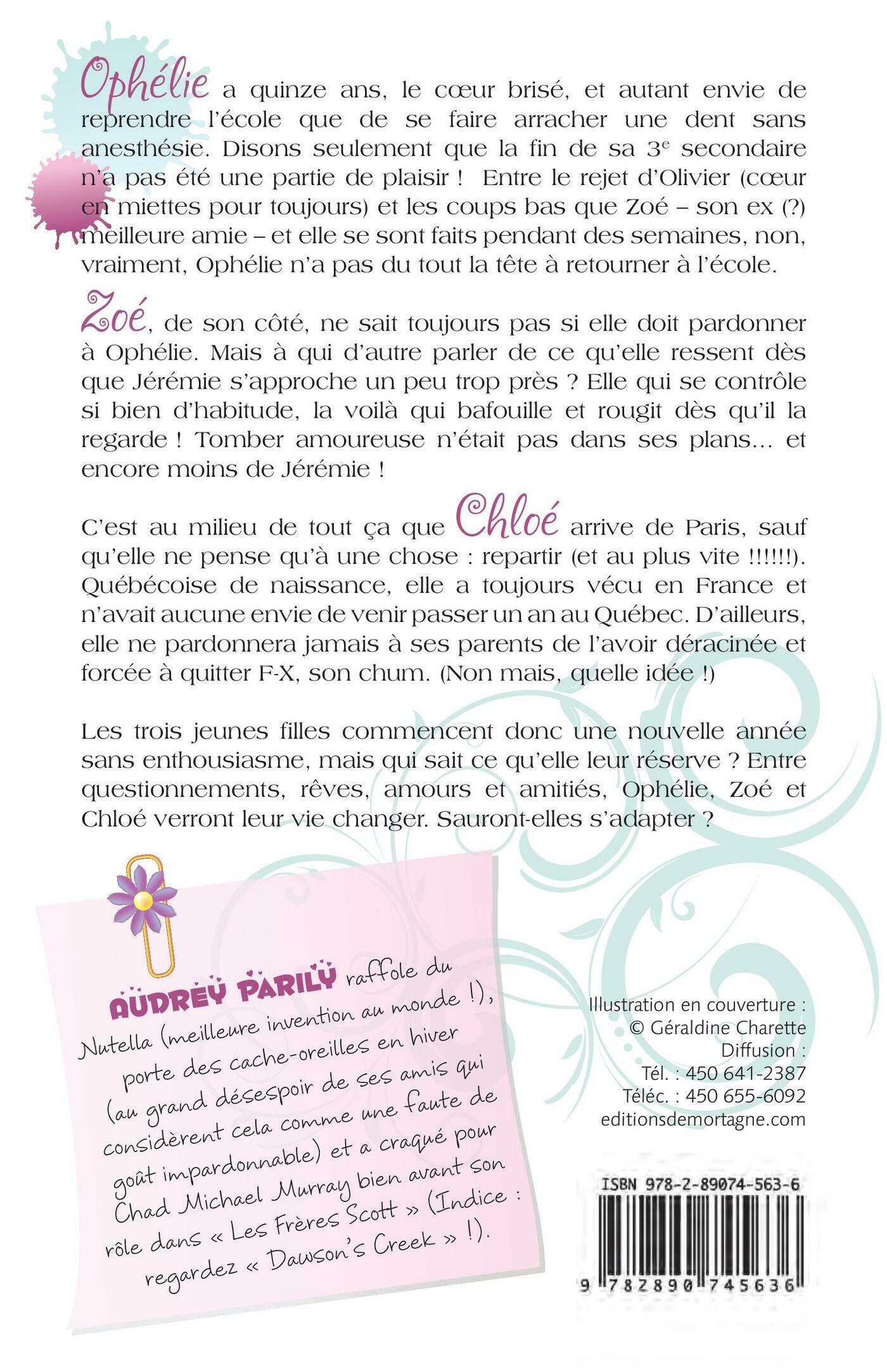 Ophélie a quinze ans, le coeur brisé, et autant envie de reprendre l'école que de se faire arracher une dent sans anesthésie. Disons seulement que la fin de sa 3e secondaire n'a pas été une partie de plaisir! Entre le rejet d'Olivier (coeur en miettes pour toujours) et les coups bas que Zoé – son ex (?) meilleure amie – et elle se sont faits pendant des semaines, non, vraiment, Ophélie n'a pas du tout la tête à retourner à l'école. Zoé, de son côté, ne sait toujours pas si elle doit pardonner à Ophélie. Mais à qui d'autre parler de ce qu'elle ressent dès que Jérémie s'approche un peu trop près? Elle qui se contrôle si bien d'habitude, la voilà qui bafouille et rougit dès qu'il la regarde! Tomber amoureuse n'était pas dans ses plans… et encore moins de Jérémie! C'est au milieu de tout ça que Chloé arrive de Paris, sauf qu'elle ne pense qu'à une chose : repartir (et au plus vite!!!!!!). Québécoise de naissance, elle a toujours vécu en France et n'avait aucune envie de venir passer un an au Québec. D'ailleurs, elle ne pardonnera jamais à ses parents de l'avoir déracinée et forcée à quitter F-X, son chum. (Non mais, quelle idée!) Les trois jeunes filles commencent donc une nouvelle année sans enthousiasme, mais qui sait ce qu'elle leur réserve? Entre questionnements, rêves, amours et amitiés, Ophélie, Zoé et Chloé verront leur vie changer. Sauront-elles s'adapter?