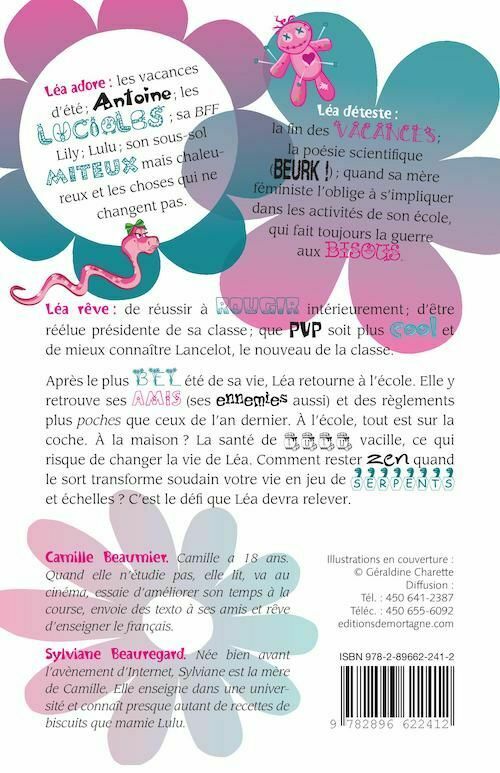 Léa adore : les vacances d'été ; Antoine ; les lucioles ; sa BFF Lily ; Lulu ; son sous-sol miteux mais chaleureux et les choses qui ne changent pas.Léa déteste : la fin des vacances ; la poésie scientifique (beurk !) ; quand sa mère féministe l'oblige à s'impliquer dans les activités de son école, qui fait toujours la guerre aux bisous. Léa rêve : de réussir à rougir intérieurement ; d'être réélue présidente de sa classe ; que PVP soit plus cool et de mieux connaître Lancelot, le nouveau de la classe.Après le plus bel été de sa vie, Léa retourne à l'école. Elle y retrouve ses amis, ses ennemies aussi et des règlements plus poches que ceux de l'an dernier. A l'école, tout est sur la coche. A la maison ? La santé de Lulu vacille, ce qui risque de changer la vie de Léa. Comment rester zen quand le sort transforme soudain votre vie en jeu de Serpents et échelles ? C'est le défi que Léa devra relever.