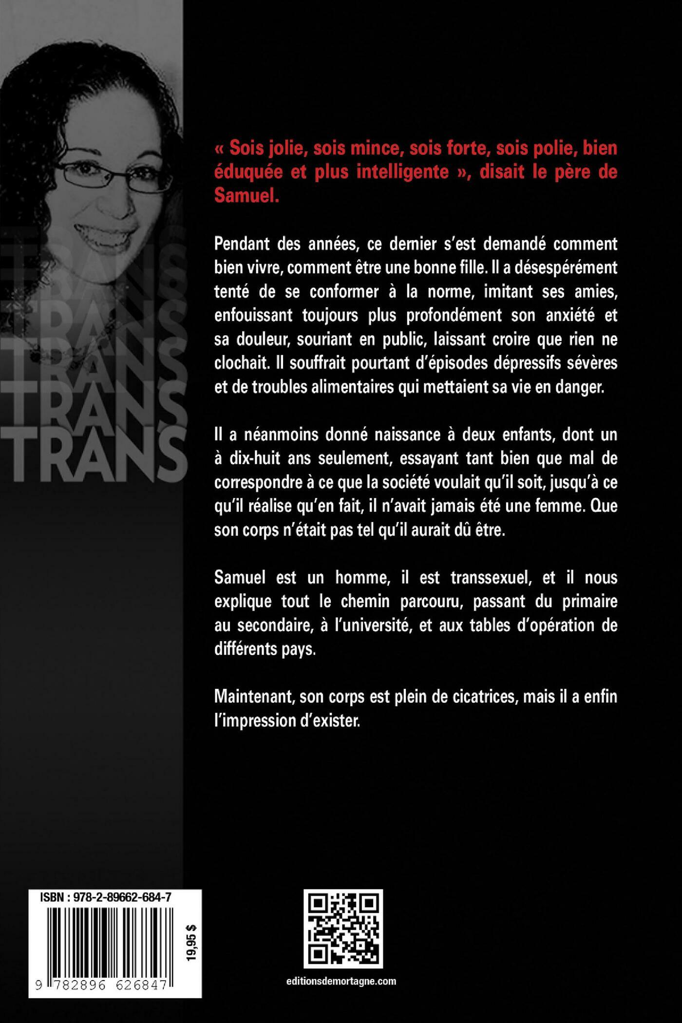 « Sois jolie, sois mince, sois forte, sois polie, bien éduquée et plus intelligente », disait le père de Samuel. Pendant des années, ce dernier s'est demandé comment bien vivre, comment être une bonne fille. Il a désespérément tenté de se conformer à la norme, imitant ses amies, enfouissant toujours plus profondément son anxiété et sa douleur, souriant en public, laissant croire que rien ne clochait. Il souffrait pourtant d'épisodes dépressifs sévères et de troubles alimentaires qui mettaient sa vie en danger. Il a néanmoins donné naissance à deux enfants, dont un à dix-huit ans seulement, essayant tant bien que mal de correspondre à ce que la société voulait qu'il soit, jusqu'à ce qu'il réalise qu'en fait, il n'avait jamais été une femme. Que son corps n'était pas tel qu'il aurait dû être.Samuel est un homme, il est transsexuel, et il nous explique tout le chemin parcouru, passant du primaire au secondaire, à l'université, et aux tables d'opération de différents pays. Maintenant, son corps est plein de cicatrices, mais il a enfin l'impression d'exister.