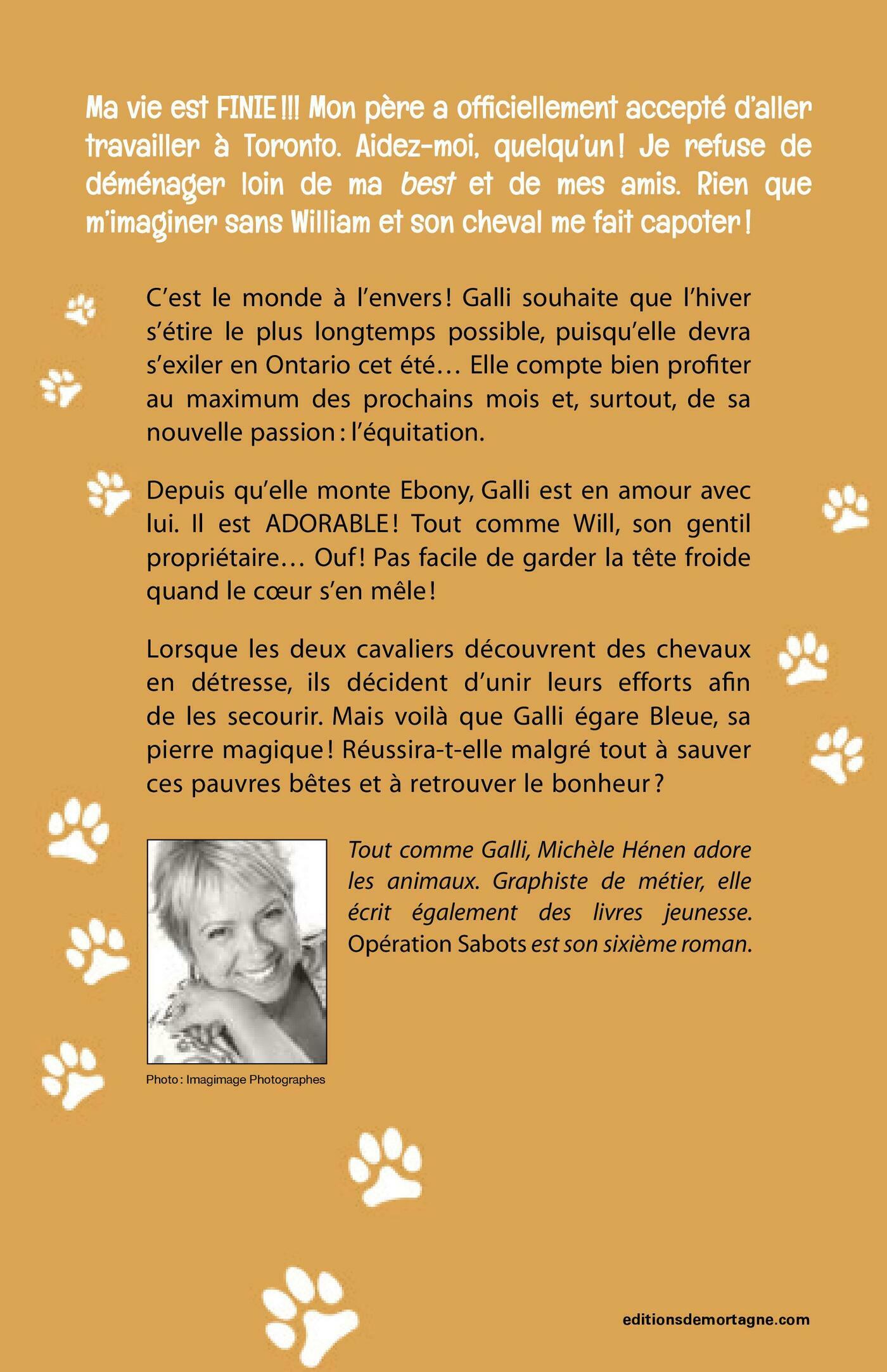 Ma vie est FINIE !!! Mon père a officiellement accepté d’aller travailler à Toronto. Aidez-moi, quelqu’un ! Je refuse de déménager loin de ma best et de mes amis. Rien que m’imaginer sans William et son cheval me fait capoter ! C’est le monde à l’envers ! Galli souhaite que l’hiver s’étire le plus longtemps possible, puisqu’elle devra s’exiler en Ontario cet été... Elle compte bien profiter au maximum des prochains mois et, surtout, de sa nouvelle passion : l’équitation. Depuis qu’elle monte Ebony, Galli est en amour avec lui. Il est ADORABLE ! Tout comme Will, son gentil propriétaire… Ouf ! Pas facile de garder la tête froide quand le cœur s’en mêle ! Lorsque les deux cavaliers découvrent des chevaux en détresse, ils décident d’unir leurs efforts afin de les secourir. Mais voilà que Galli égare Bleue, sa pierre magique ! Réussira-t-elle malgré tout à sauver ces pauvres bêtes et à retrouver le bonheur ?