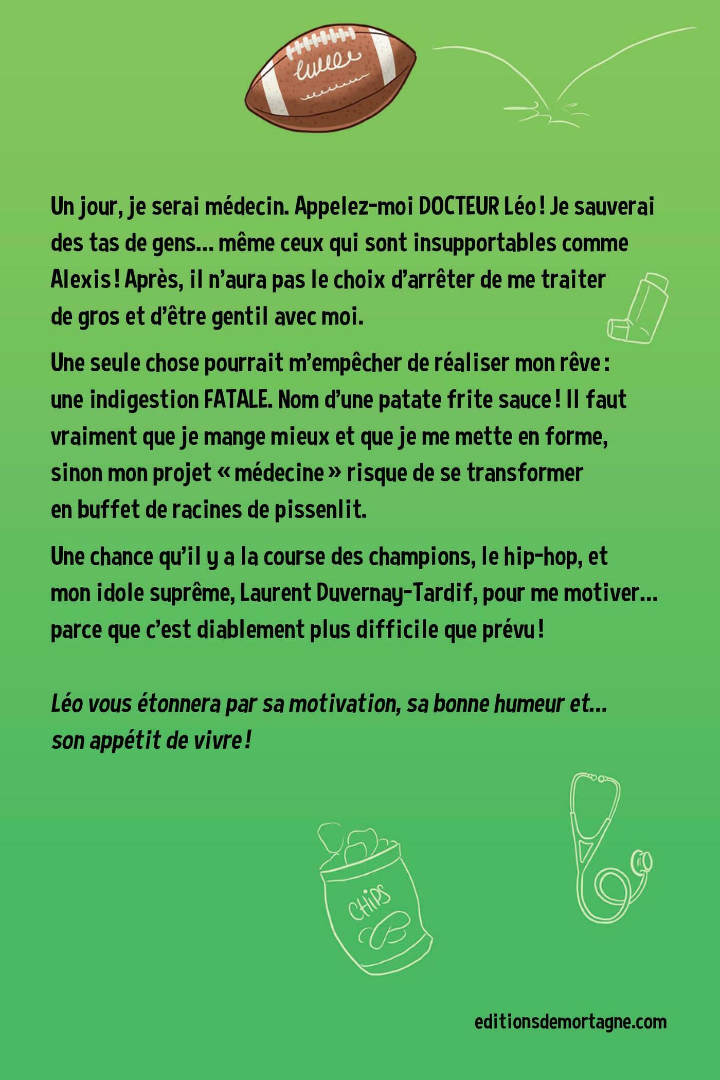 Un jour, je serai médecin. Appelez-moi DOCTEUR Léo! Je sauverai des tas de gens… même ceux qui sont insupportables comme Alexis! Après, il n’aura pas le choix d’arrêter de me traiter de gros et d’être gentil avec moi.Une seule chose pourrait m’empêcher de réaliser mon rêve : une indigestion FATALE. Nom d’une patate frite sauce! Il faut vraiment que je mange mieux et que je me mette en forme, sinon mon projet « médecine » risque de se transformer en buffet de racines de pissenlit.Une chance qu’il y a la course des champions, le hip-hop, et mon idole suprême, Laurent Duvernay-Tardif, pour me motiver… parce que c’est diablement plus difficile que prévu!Léo vous étonnera par sa motivation, sa bonne humeur et… son appétit de vivre!