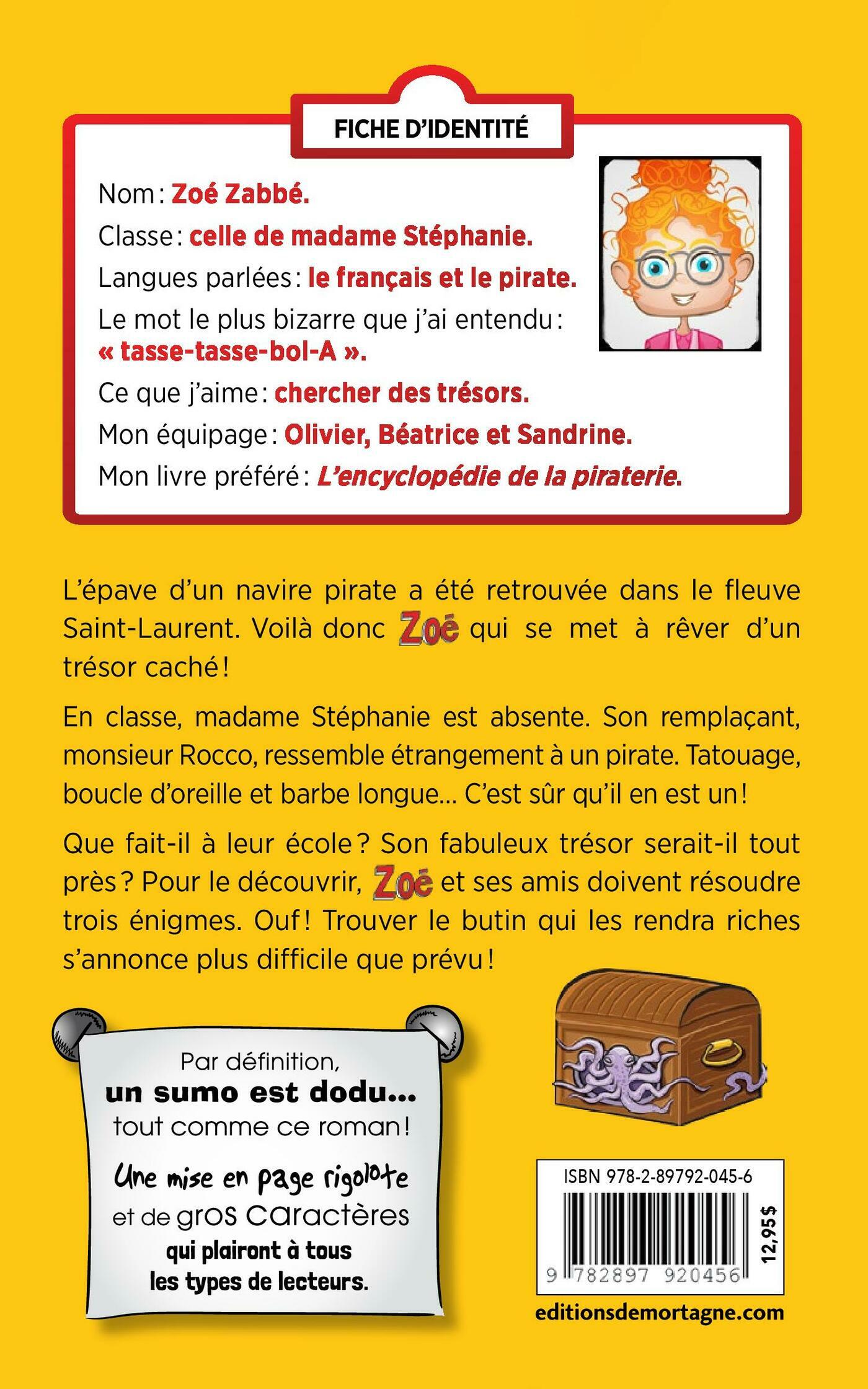 Fiche d’identitéNom : Zoé Zabbé.Classe : celle de madame Stéphanie.Langues parlées : le français et le pirate.Le mot le plus bizarre que j’ai entendu : « tasse-tasse-bol-A ».Ce que j’aime : chercher des trésors.Mon équipage : Olivier, Béatrice et Sandrine.Mon livre préféré : L’encyclopédie de la piraterie. L’épave d’un navire pirate a été retrouvée dans le fleuve Saint-Laurent. Voilà donc Zoé qui se met à rêver d’un trésor caché !En classe, madame Stéphanie est absente. Son remplaçant, monsieur Rocco, ressemble étrangement à un pirate. Tatouage, boucle d’oreille et barbe longue… Aucun doute possible, il en est un !Que fait-il à leur école ? Son fabuleux trésor serait-il tout près ? Pour le découvrir, Zoé et ses amis doivent résoudre trois énigmes. Ouf ! Trouver le butin qui les rendra riches s’annonce plus difficile que prévu !Une série écrite par une maman et sa fille !