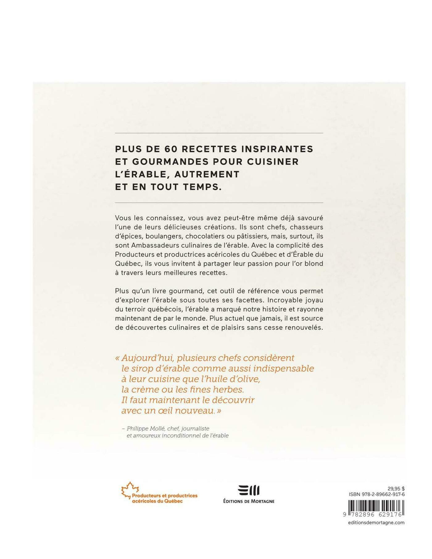 Plus de 60 recettes inspirantes et gourmandes pour cuisiner l’érable, autrement et en tout temps.Vous les connaissez, vous avez peut-être même déjà savouré l’une de leurs délicieuses créations. Ils sont chefs, chasseurs d’épices, boulangers, chocolatiers ou pâtissiers, mais, surtout, ils sont Ambassadeurs culinaires de l’érable. Avec la complicité de la Fédération des producteurs acéricoles du Québec et Érable du Québec, ils nous invitent à partager leur passion pour l’or blond à travers leurs meilleures recettes.Plus qu’un livre gourmand, cet outil de référence nous permet d’explorer l’érable sous toutes ses facettes. Incroyable joyau du terroir québécois, l’érable a marqué notre histoire et rayonne aujourd’hui de par le monde. Plus actuel que jamais, il est source de découvertes culinaires et de plaisirs sans cesse renouvelés.Aujourd’hui, plusieurs chefs considèrent le sirop d’érable comme aussi indispensable à leur cuisine que l’huile d’olive, la crème ou les fines herbes. ‒ Philippe Mollé, chef, journaliste et amoureux inconditionnel de l’érable, fier porte-parole et collaborateur du livre