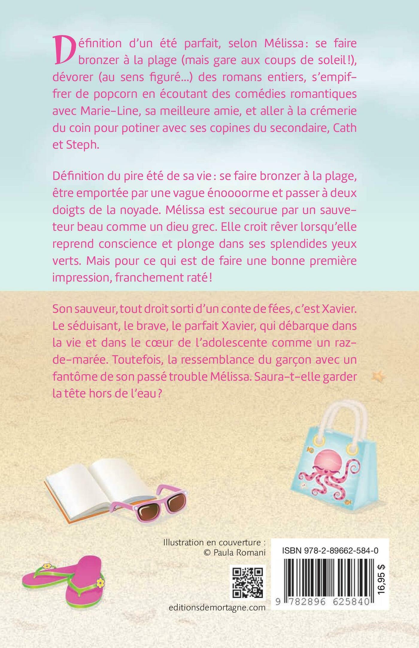 Définition d'un été parfait, selon Mélissa : se faire bronzer à la plage (mais gare aux coups de soleil!), dévorer (au sens figuré…) des romans entiers, s'empiffrer de popcorn en écoutant des comédies romantiques avec Marie-Line, sa meilleure amie, et aller à la crémerie du coin pour potiner avec ses copines du secondaire, Cath et Steph.Définition du pire été de sa vie : se faire bronzer à la plage, être emportée par une vague énoooorme et passer à deux doigts de la noyade. Mélissa est secourue par un sauveteur beau comme un dieu grec. Elle croit rêver lorsqu'elle reprend conscience et plonge ses splendides yeux verts. Mais pour de ce qui est une bonne première impression, franchement raté!Son sauveteur, tout droit sorti d'un conte de fées, c'est Xavier. Le séduisant, le brave, le parfait Xavier, qui débarque dans la vie et dans le coeur de l'adolescente, comme un raz-de-marée. Toutefois, la ressemblance du garçon avec un fantôme de son passé trouble Mélissa. Saura-t-elle garder la tête hors de l'eau?
