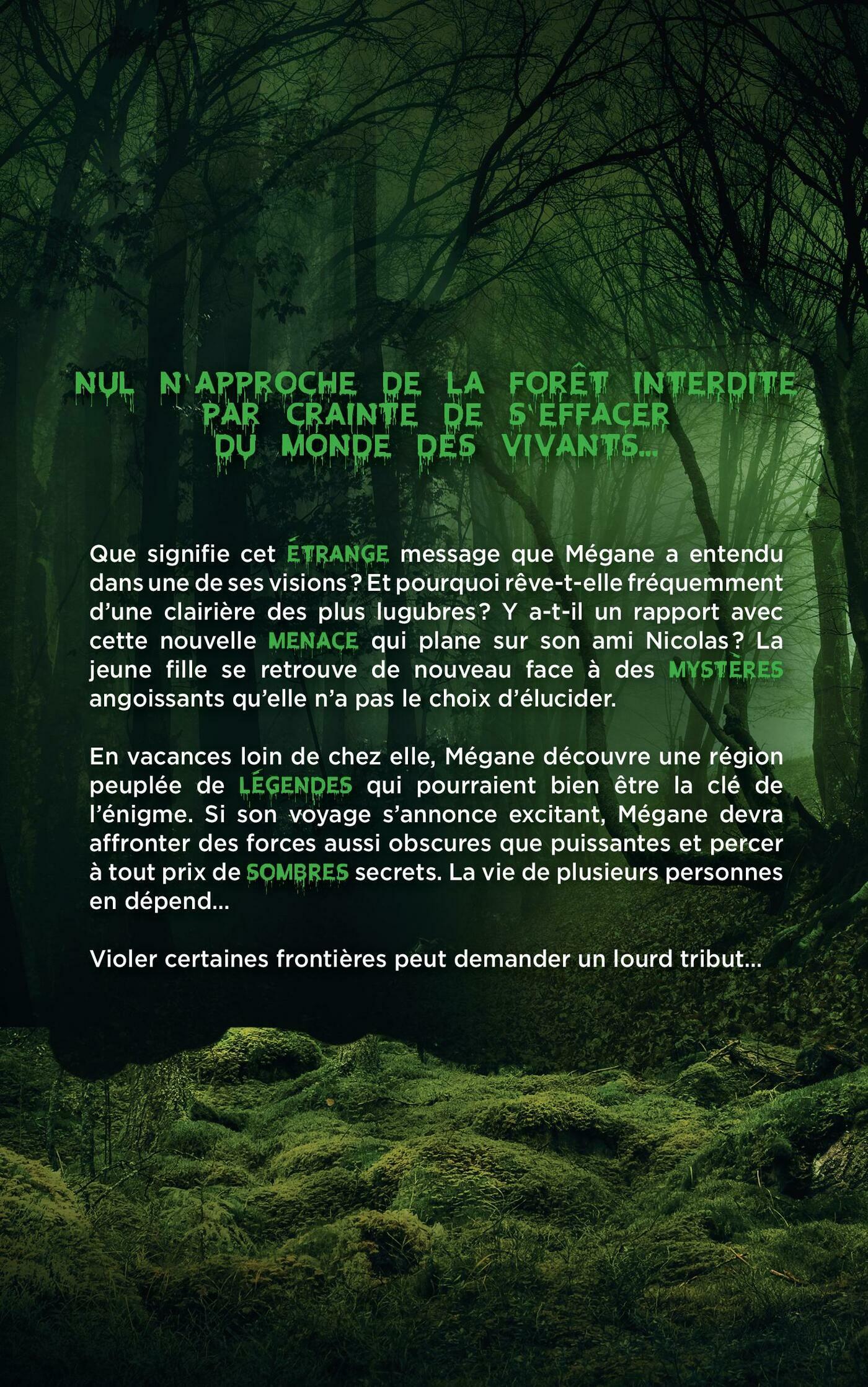 NUL N’APPROCHE DE LA FORÊT INTERDITE PAR CRAINTE DE S’EFFACER DU MONDE DES VIVANTS… Que signifie cet étrange message que Mégane a entendu dans une de ses visions ? Et pourquoi rêve-t-elle fréquemment d’une clairière des plus lugubres ? Y a-t-il un rapport avec cette nouvelle menace qui plane sur son ami Nicolas ? La jeune fille se retrouve de nouveau face à des mystères angoissants qu’elle n’a pas le choix d’élucider.En vacances loin de chez elle, Mégane découvre une région peuplée de légendes qui pourraient bien être la clé de l’énigme. Si son voyage s’annonce excitant, Mégane devra affronter des forces aussi obscures que puissantes et percer à tout prix de sombres secrets. La vie de plusieurs personnes en dépend…Violer certaines frontières peut demander un lourd tribut…