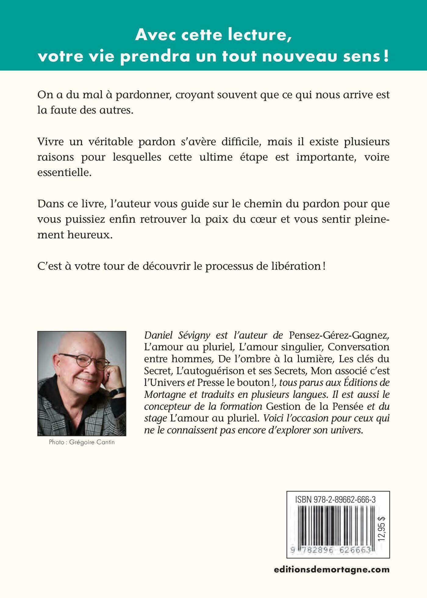 Avec cette lecture, votre vie prendra un tout nouveau sens !On a du mal à pardonner, croyant souvent que ce qui nous arrive est la faute des autres. Vivre un véritable pardon s'avère difficile, mais il existe plusieurs raisons pour lesquelles cette ultime étape est importante, voire essentielle.Dans ce livre, l'auteur vous guide sur le chemin du pardon pour que vous puissiez enfin retrouver la paix du coeur et vous sentir pleinement heureux. C'est à votre tour de découvrir le processus de libération ! Daniel Sévigny est l'auteur de Pensez-Gérez-Gagnez, Les clés du Secret, L'autoguérison et ses secrets ainsi que Il ne faut jamais jamais jamais se fâcher, tous parus aux Editions de Mortagne et traduits en plusieurs langues. Il est aussi le concepteur de la formation Gestion de la Pensée et du stage L'amour au pluriel. Voici l'occasion pour ceux qui ne le connaissent pas encore d'explorer son univers.