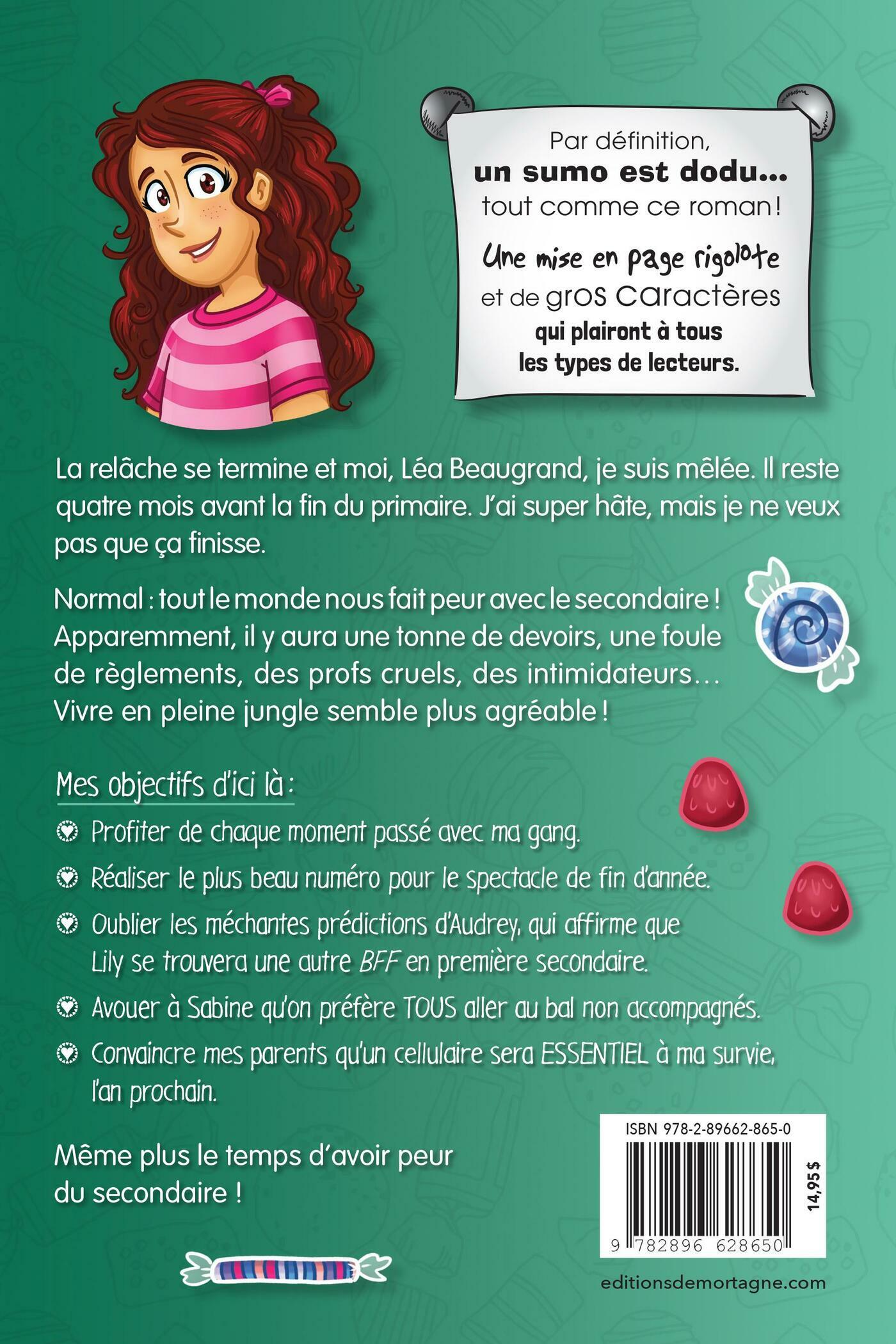La relâche se termine et moi, Léa Beaugrand, je suis mêlée. Il reste quatre mois avant la fin du primaire. J’ai super hâte, mais je ne veux pas que ça finisse.Normal : tout le monde nous fait peur avec le secondaire ! Apparemment, il y aura une tonne de devoirs, une foule de règlements, des profs cruels, des intimidateurs... Vivre en pleine jungle semble plus agréable ! Mes objectifs d’ici là : - Profiter de chaque moment passé avec ma gang. - Réaliser le plus beau numéro pour le spectacle de fin d’année.- Oublier les méchantes prédictions d’Audrey, qui affirme que Lily se trouvera une autre BFF en première secondaire. - Avouer à Sabine qu’on préfère TOUS aller au bal non accompagnés. - Convaincre mes parents qu’un cellulaire sera ESSENTIEL à ma survie, l’an prochain.Même plus le temps d’avoir peur du secondaire !