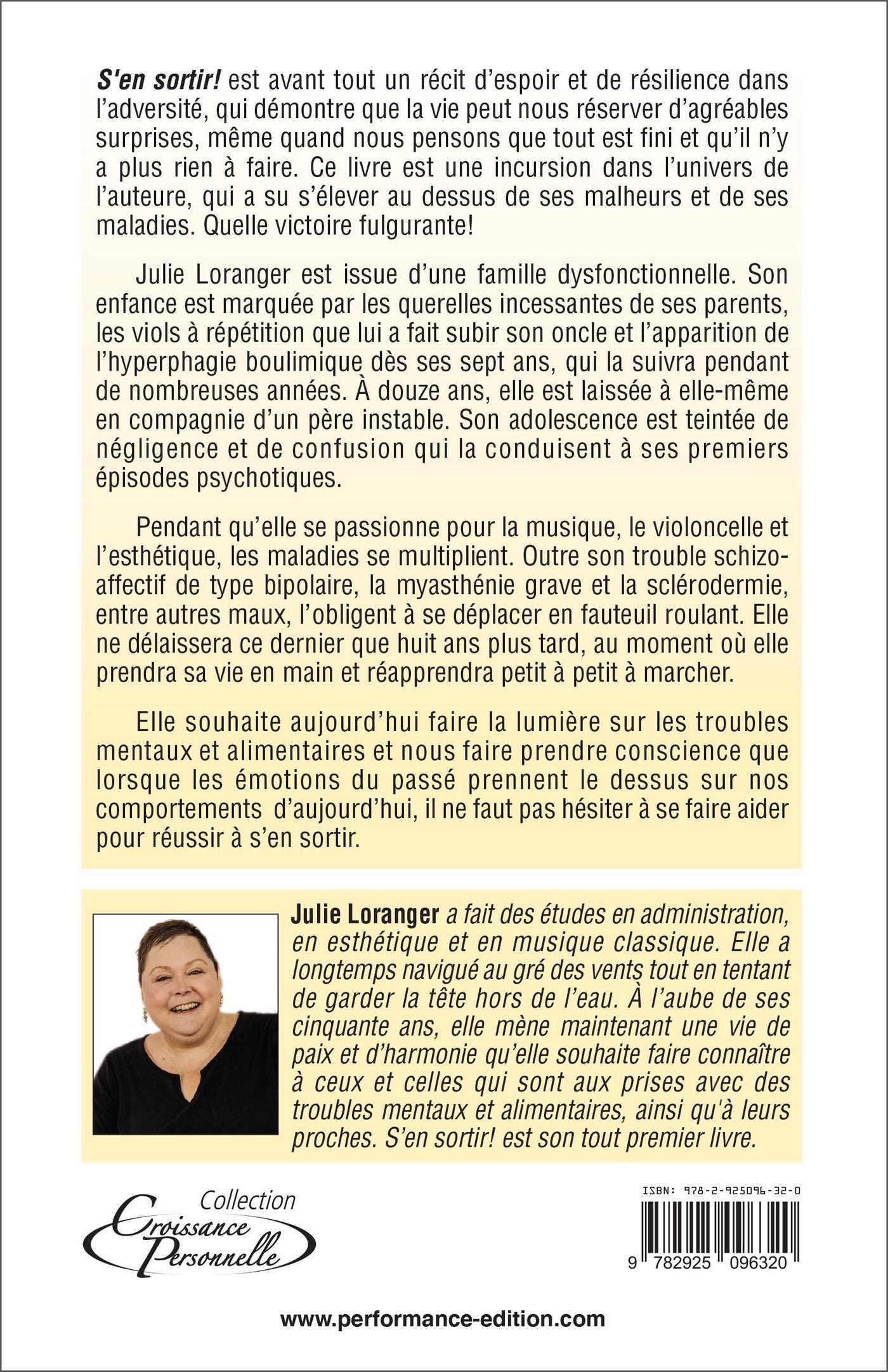 S'en sortir! est avant tout un récit d’espoir et de résilience dans l’adversité, qui démontre que la vie peut nous réserver d’agréables surprises, même quand nous pensons que tout est fini et qu’il n’y a plus rien à faire. Ce livreest une incursion dans l’univers de l’auteure, qui a su s’élever au dessus de ses malheurs et de ses maladies. Quelle victoire fulgurante!Julie Loranger est issue d’une famille dysfonctionnelle. Son enfance est marquée par les querelles incessantes de ses parents, les viols à répétition que lui a fait subir son oncle et l’apparition de l’hyperphagie boulimique dès ses sept ans, qui la suivra pendant de nombreuses années. À douze ans, elle est laissée à elle-même en compagnie d’un père instable. Son adolescence est teintée de négligence et de confusion qui la conduisent à ses premiers épisodes psychotiques.Malgré son grand amour pour la musique et le violoncelle ainsi qu’un travail en esthétique qui la passionne, elle reste longtemps aux prises avec un trouble schizo-affectif de type bipolaire pendant que son hyperphagie l’amène à peser près de cent quatre-vingts kilos, ce qui l'oblige à se déplacer en fauteuil roulant. Elle ne délaissera ce dernier que huit ans plustard, au moment où elle prendra sa vie en main et réapprendra petit à petit à marcher.Elle souhaite aujourd’hui faire la lumière sur les troubles mentaux et alimentaires et nous faire prendre conscience que lorsque les émotions du passé prennent le dessus sur nos comportements d’aujourd’hui, il ne faut pas hésiter à se faire aider pour réussir à s’en sortir.