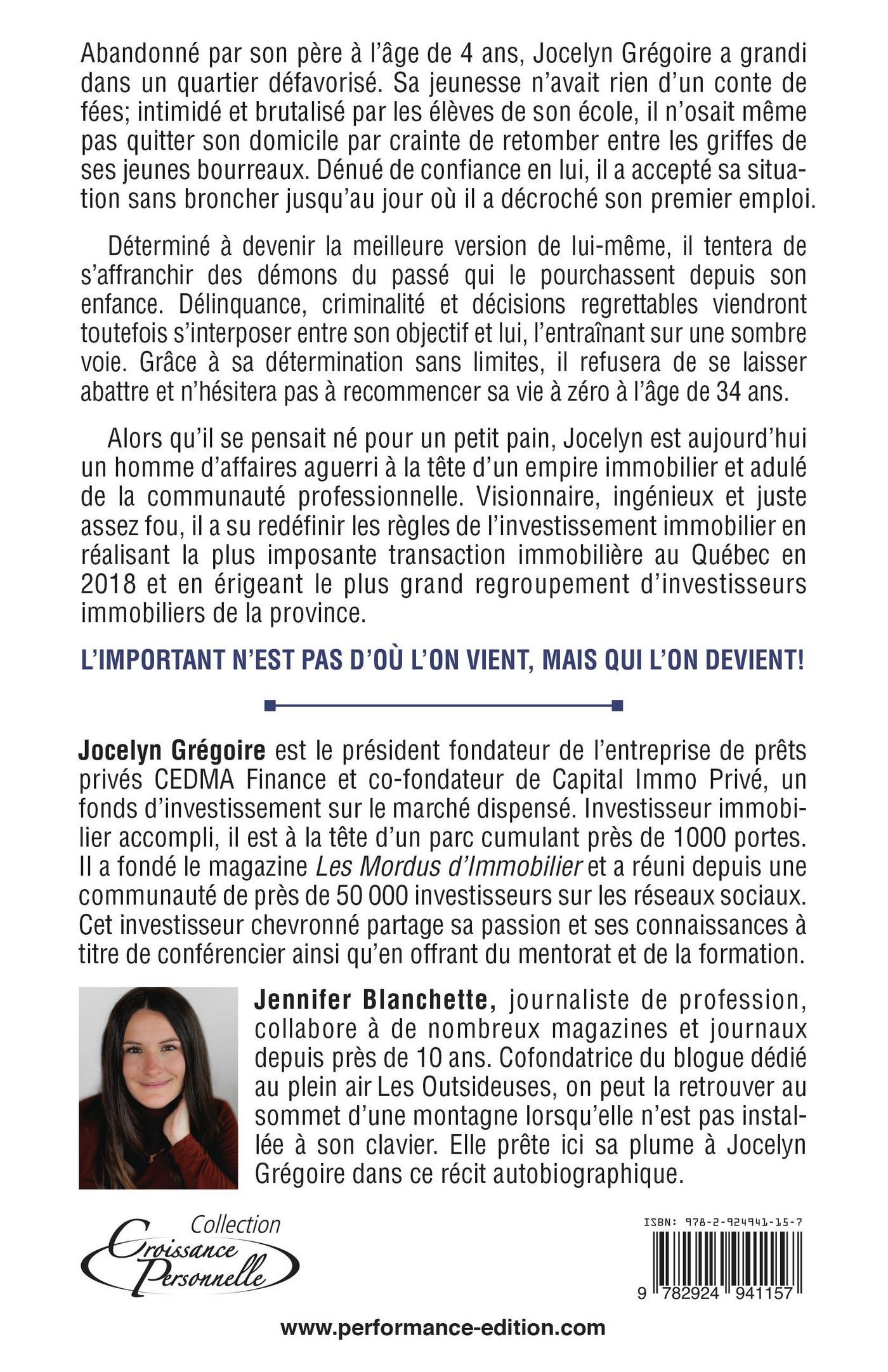 Abandonné par son père à l’âge de 4 ans, Jocelyn Grégoire a grandi dans un quartier défavorisé. Sa jeunesse n’avait rien d’un conte de fées; intimidé et brutalisé par les élèves de son école, il n’osait même pas quitter son domicile par crainte de retomber entre les griffes de ses jeunes bourreaux. Dénué de confiance en lui, il a accepté sa situation sans broncher jusqu’au jour où il a décroché son premier emploi. Déterminé à devenir la meilleure version de lui-même, il tentera de s’affranchir des démons du passé qui le pourchassent depuis son enfance. Délinquance, criminalité et décisions regrettables viendront toutefois s’interposer entre son objectif et lui, l’entraînant sur une sombre voie. Grâce à sa détermination sans limites, il refusera de se laisser abattre et n’hésitera pas à recommencer sa vie à zéro à l’âge de 34 ans. Alors qu’il se pensait né pour un petit pain, Jocelyn est aujourd’hui un homme d’affaires aguerri à la tête d’un empire immobilier et adulé de la communauté professionnelle. Visionnaire, ingénieux et juste assez fou, il a su redéfinir les règles de l’investissement immobilier en réalisant la plus imposante transaction immobilière au Québec en 2018 et en érigeant le plus grand regroupement d’investisseurs immobiliers de la province.