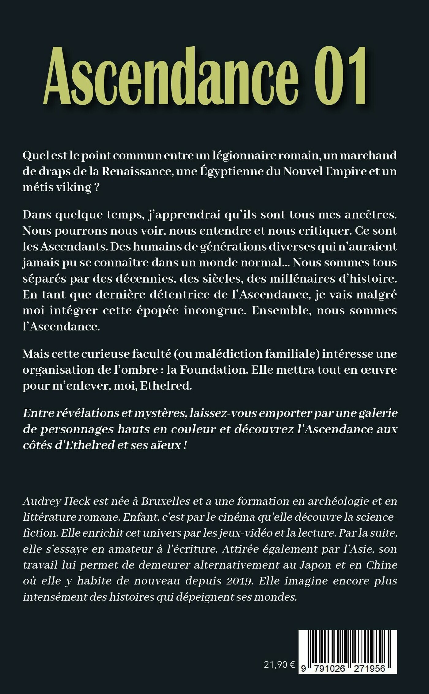 Quel est le point commun entre un légionnaire romain, un marchand de draps de la Renaissance, une Égyptienne du Nouvel Empire et un métis viking ?Dans quelque temps, j’apprendrai qu’ils sont tous mes ancêtres. Nous pourrons nous voir, nous entendre et nous critiquer. Ce sont les Ascendants. Des humains de générations diverses qui n’auraient jamais pu se connaître dans un monde normal… Nous sommes tous séparés par des décennies, des siècles, des millénaires d’histoire. En tant que dernière détentrice de l’Ascendance, je vais malgré moi intégrer cette épopée incongrue. Ensemble, nous sommes l’Ascendance.Mais cette curieuse faculté (ou malédiction familiale) intéresse une organisation de l’ombre : la Foundation. Elle mettra tout en œuvre pour m’enlever, moi, Ethelred.Entre révélations et mystères, laissez-vous emporter par une galerie de personnages hauts en couleur et découvrez l’Ascendance aux côtés d’Ethelred et ses aïeux !