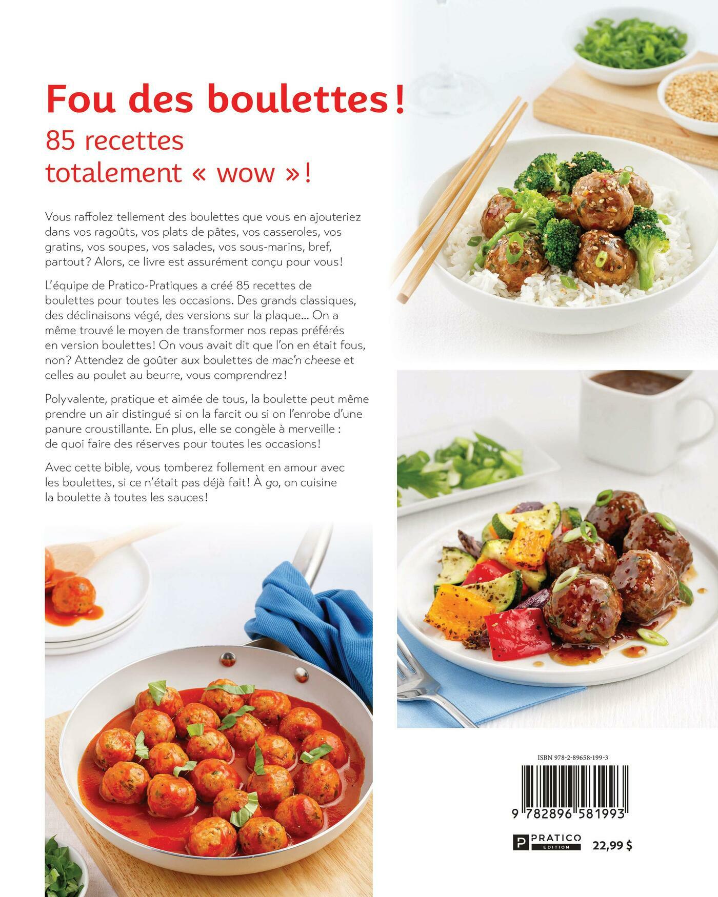 Vous raffolez tellement des boulettes que vous en ajouteriez dans vos ragoûts, vos plats de pâtes, vos casseroles, vos gratins, vos soupes, vos salades, vos sous-marins, bref, partout ? Alors, ce livre est assurément conçu pour vous ! L’équipe de Pratico Pratiques a créé 85 recettes de boulettes pour toutes les occasions. Des grands classiques, des déclinaisons végé, des versions sur la plaque… On a même trouvé le moyen de transformer nos repas préférés en version boulettes ! On vous avait dit que l’on en était fous, non ? Attendez de goûter aux boulettes de mac’n cheese et celles au poulet au beurre, vous comprendrez !Polyvalente, pratique et aimée de tous, la boulette peut même prendre un air distingué si on la farcit ou si on l’enrobe d’une panure croustillante. En plus, elle se congèle à merveille : de quoi faire des réserves pour toutes les occasions !Avec cette bible, vous tomberez follement en amour avec les boulettes, si ce n’était pas déjà fait ! À go, on cuisine la boulette à toutes les sauces !