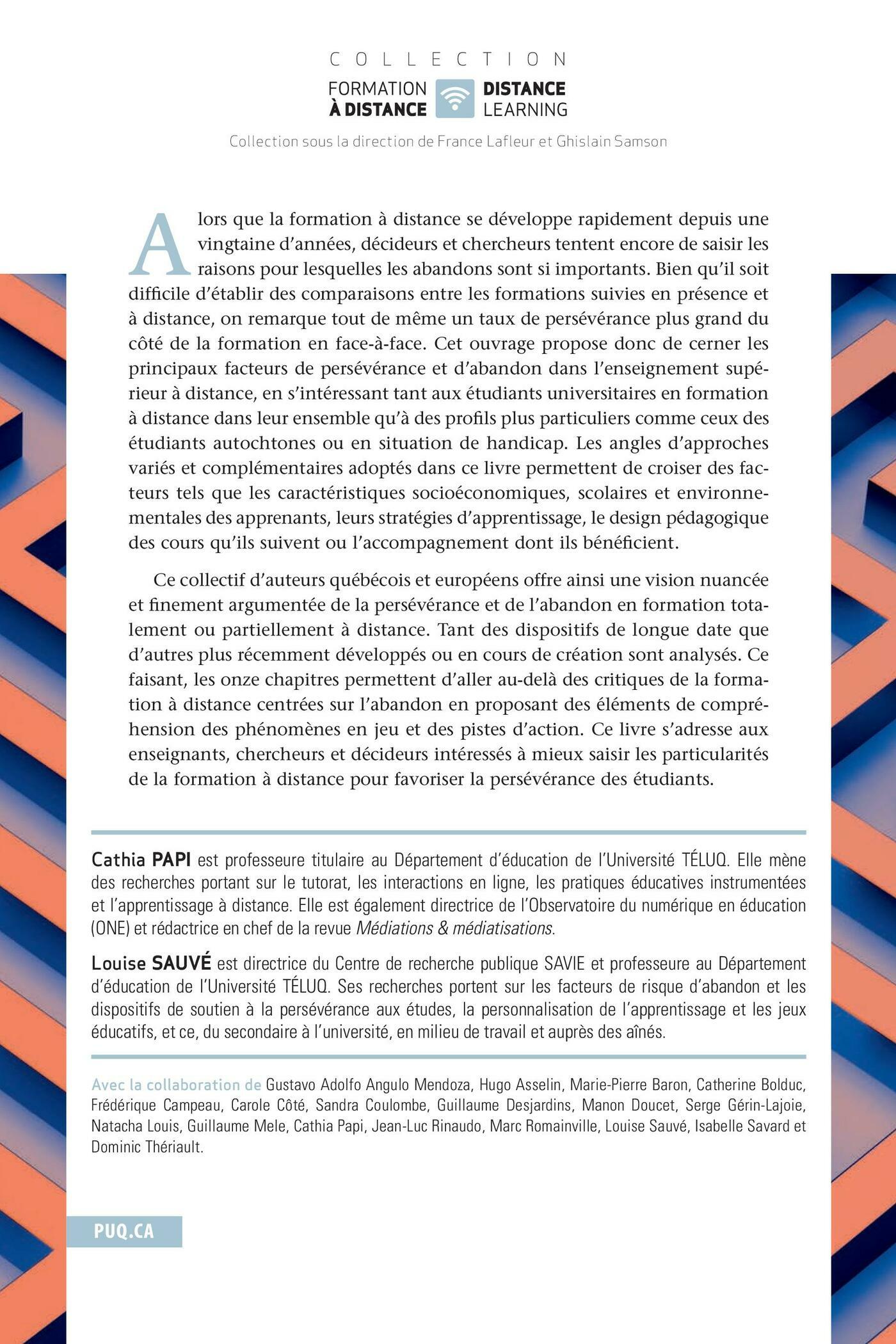 Alors que la formation à distance se développe rapidement depuis une vingtaine d’années, décideurs et chercheurs tentent encore de saisir les raisons pour lesquelles les abandons sont si importants. Bien qu’il soit difficile d’établir des comparaisons entre les formations suivies en présence et à distance, on remarque tout de même un taux de persévérance plus grand du côté de la formation en face-à-face. Cet ouvrage propose donc de cerner les principaux facteurs de persévérance et d’abandon dans l’enseignement supérieur à distance, en s’intéressant tant aux étudiants universitaires en formation à distance dans leur ensemble qu’à des profils plus particuliers comme ceux des étudiants autochtones ou en situation de handicap. Les angles d’approches variés et complémentaires adoptés dans ce livre permettent de croiser des facteurs tels que les caractéristiques socioéconomiques, scolaires et environnementales des apprenants, leurs stratégies d’apprentissage, le design pédagogique des cours qu’ils suivent ou l’accompagnement dont ils bénéficient.
