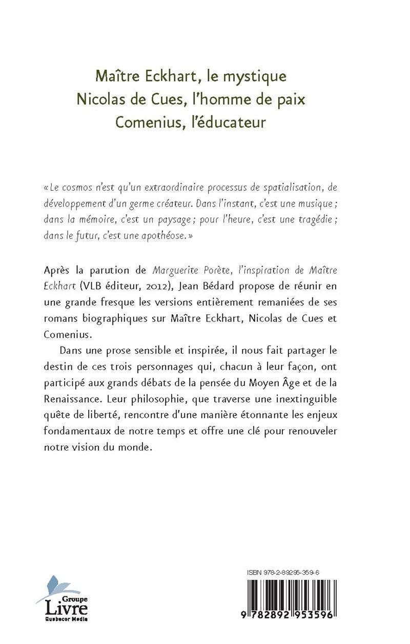 « Le cosmos n'est qu'un extraordinaire processus de spatialisation, de développement d'un germe créateur. Dans l'instant, c'est une musique ; dans la mémoire, c'est un paysage ; pour l'heure, c'est une tragédie ; dans le futur, c'est une apothéose. » Après la parution de Marguerite Porète, l'inspiration de Maître Eckhart (VLB éditeur, 2012), Jean Bédard propose de réunir et une grande fresque les versions entièrement remaniées de ses romans biographiques sur Maître Eckhart, Nicolas de Cues et Comenius.