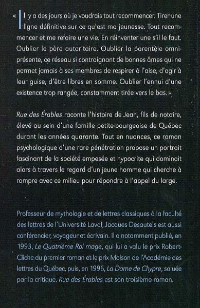 Rue des Érables raconte l'histoire de Jean, fils de notaire, élevé au sein d'une famille petite-bourgeoise de Québec durant les années quarante. Tout en nuances, ce roman psychologique d'une rare pénétration propose un portrait fascinant de la société empesée et hypocrite qui dominait alors à travers le regard d'un jeune homme qui cherche à rompre avec ce milieu pour répondre à l'appel du large.