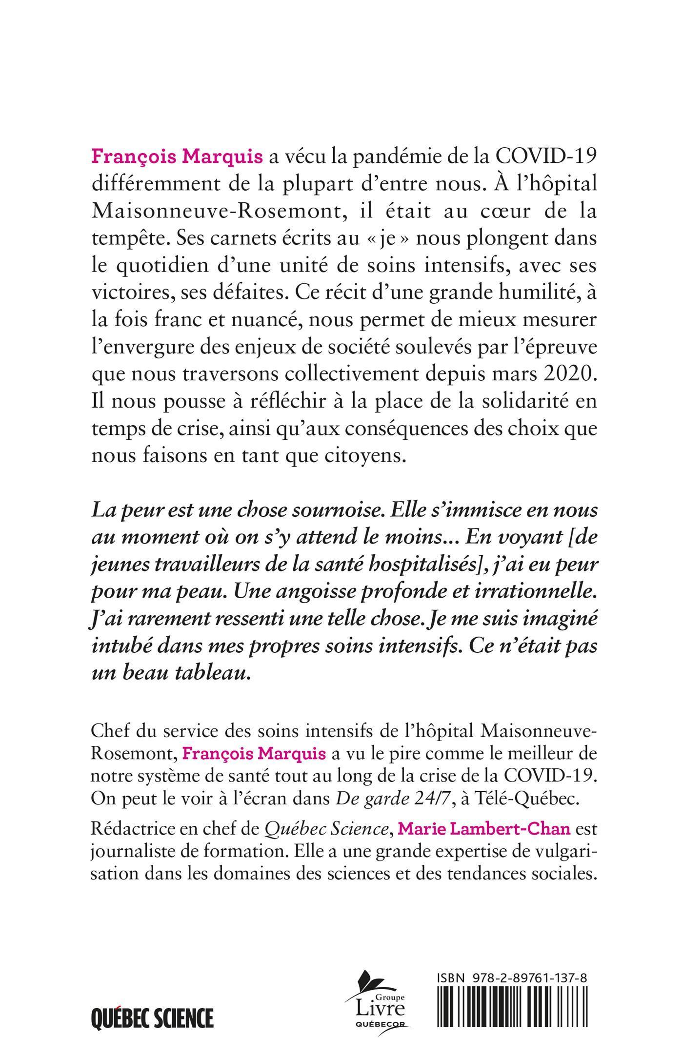 François Marquis a vécu la pandémie de la COVID-19 différemment de la plupart d'entre nous. À l'hôpital Maisonneuve-Rosemont, il était au cœur de la tempête. Ses carnets écrits au « je » nous plongent dans le quotidien d'une unité de soins intensifs, avec ses victoires, ses défaites. Ce récit d'une grande humilité, à la fois franc et nuancé, nous permet de mieux mesurer l'envergure des enjeux de société soulevés par l'épreuve que nous traversons collectivement depuis mars 2020. Il nous pousse à réfléchir à la place de la solidarité en temps de crise, ainsi qu'aux conséquences des choix que nous faisons en tant que citoyens.