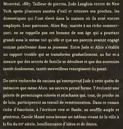 Montréal, 1887. Tailleur de pierres, Jude Langlois rentre de New York après plusieurs années d'exil et retrouve ses proches, les domestiques qui l'ont élevé dans la maison où ils sont encore employés. Leur patronne, Alice Roy, mariée à un riche commerçant, ne se rappelle pas cet homme de son âge qui a pourtant grandi sous le même toit qu'elle et que ses parents avaient engagé comme palefrenier dans sa jeunesse. Entre Jude et Alice s'établit un rapport trouble qui se transforme graduellement, au fur et à mesure que des secrets de famille se dévoilent et que des souvenirs tantôt douloureux, tantôt merveilleux resurgissent du passé. De cette recherche de racines qu'entreprend Jude à cette quête de mémoire que mène Alice, un univers prend forme. Y évoluent une galerie de personnages colorés et attachants qui, tous, de proche ou de loin, participeront au travail de remémoration. Dans ce roman riche d'émotions, à l'écriture vive et fluide, au souffle ample et généreux, Carole Massé nous brosse un tableau vivant de la ville à la fin du XIXe siècle, bouillonnante d'idées et de désirs.