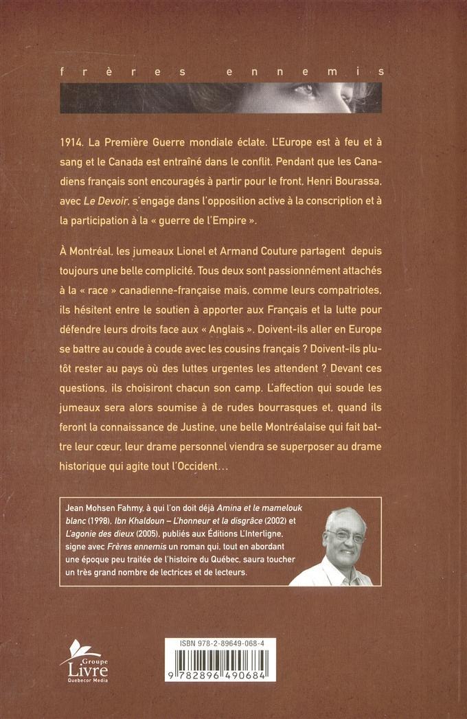 À Montréal, les jumeaux Lionel et Armand Couture partagent depuis toujours une belle complicité. Tous deux sont passionnément attachés à la « race » canadienne-française mais, comme leurs compatriotes, ils hésitent entre le soutien à apporter aux Français et la lutte pour défendre leurs droits face aux « Anglais ». Doivent-ils aller en Europe se battre au coude à coude avec les cousins français ? Doivent-ils plutôt rester au pays où des luttes urgentes les attendent ? Devant ces questions, ils choisiront chacun son camp. L'affection qui soude les jumeaux sera alors soumise à de rudes bourrasques et, quand ils feront la connaissance de Justine, une belle Montréalaise qui fait battre leur coeur, leur drame personnel viendra se superposer au drame historique qui agite tout l'Occident...