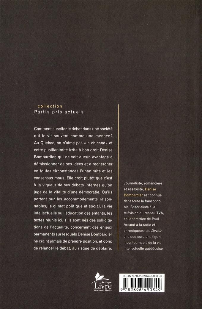 Comment susciter le débat dans une société qui le vit souvent comme une menace? Au Québec, on n'aime pas «la chicane» et cette pusillanimité irrite à bon droit Denise Bombardier, qui ne voit aucun avantage à démissionner de ses idées et à rechercher en toutes circonstances l'unanimité et les consensus mous. Elle croit plutôt que c'est à la vigueur de ses débats internes qu'on juge de la vitalité d'une démocratie. Qu'ils portent sur les accommodements raisonnables, le climat politique et social, la vie intellectuelle ou l'éducation des enfants, les textes réunis ici, s'ils sont nés des sollicitations de l'actualité, concernent des enjeux permanents sur lesquels Denise Bombardier ne craint jamais de prendre position, et donc de relancer le débat, au risque de déplaire.