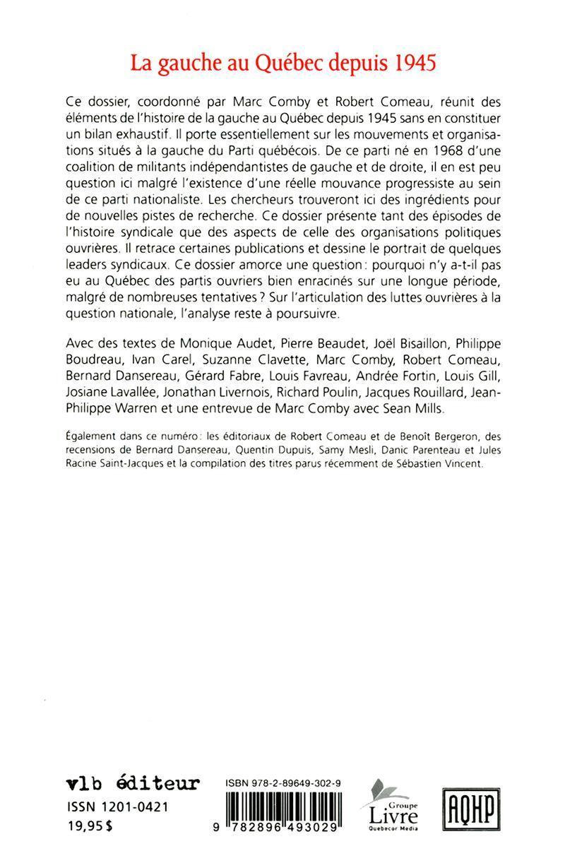 Ce dossier, coordonné par Marc Comby et Robert Comeau, réunit des éléments de l'histoire de la gauche au Québec depuis 1945 sans en constituer un bilan exhaustif. Il porte essentiellement sur les mouvements et organisations situés à la gauche du Parti québécois. De ce parti né en 1968 d'une coalition de militants indépendantistes de gauche et de droite, il en est peu question ici malgré l'existence d'une réelle mouvance progressiste au sein de ce parti nationaliste. Les chercheurs trouveront ici des ingrédients pour de nouvelles pistes de recherche. Ce dossier présente tant des épisodes de l'histoire syndicale que des aspects de celle des organisations politiques ouvrières. Il retrace certaines publications et dessine le portrait de quelques leaders syndicaux. Ce dossier amorce une question : pourquoi n'y a-t-il pas eu au Québec des partis ouvriers bien enracinés sur une longue période, malgré de nombreuses tentatives ? Sur l'articulation des luttes ouvrières à la question nationale, l'analyse reste à poursuivre.