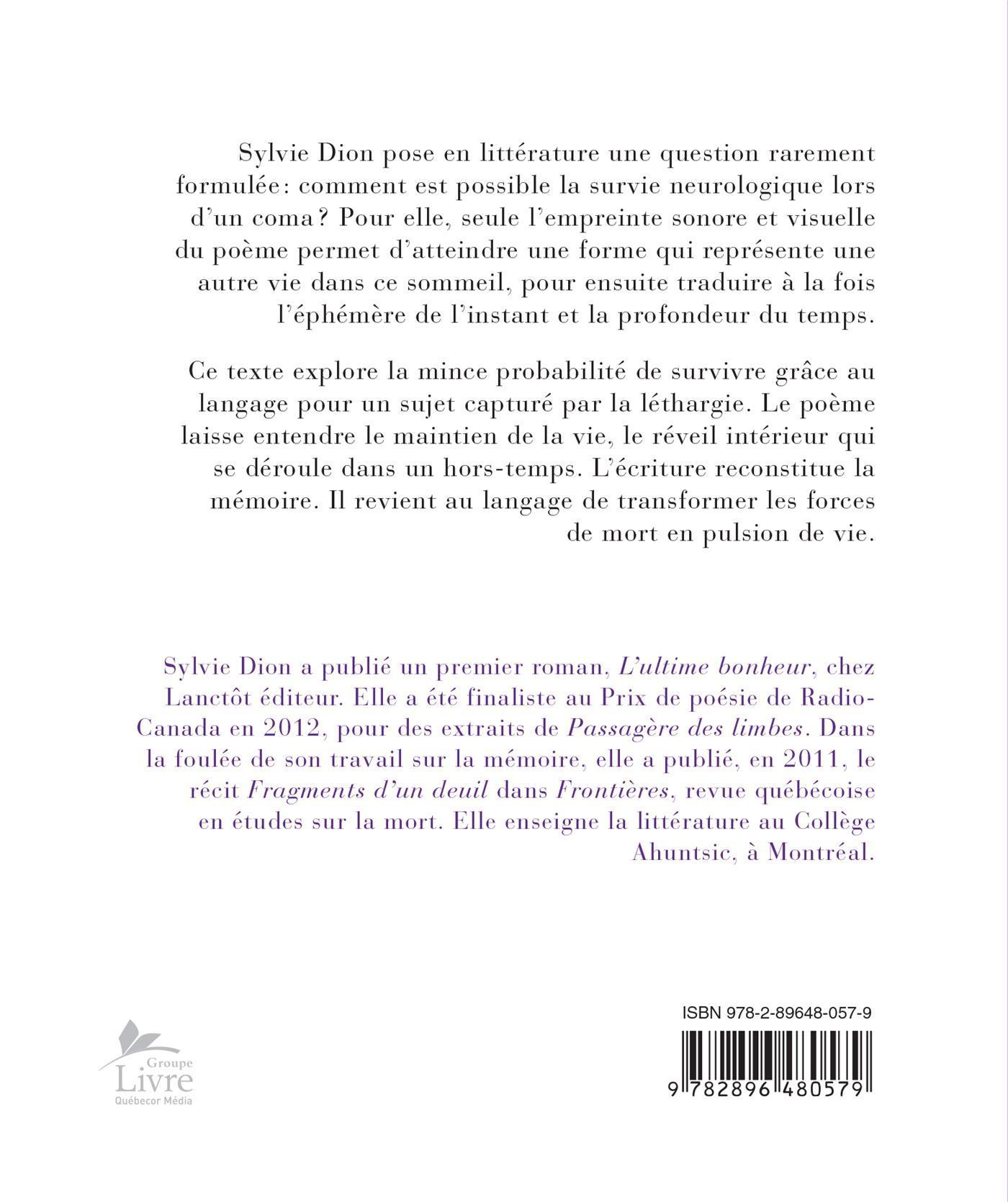 Sylvie Dion pose en littérature une question rarement formulée : comment est possible la survie neurologique lors d'un coma ? Pour elle, seule l'empreinte sonore et visuelle du poème permet d'atteindre une forme qui représente une autre vie dans ce sommeil, pour ensuite traduire à la fois l'éphémère de l'instant et la profondeur du temps.