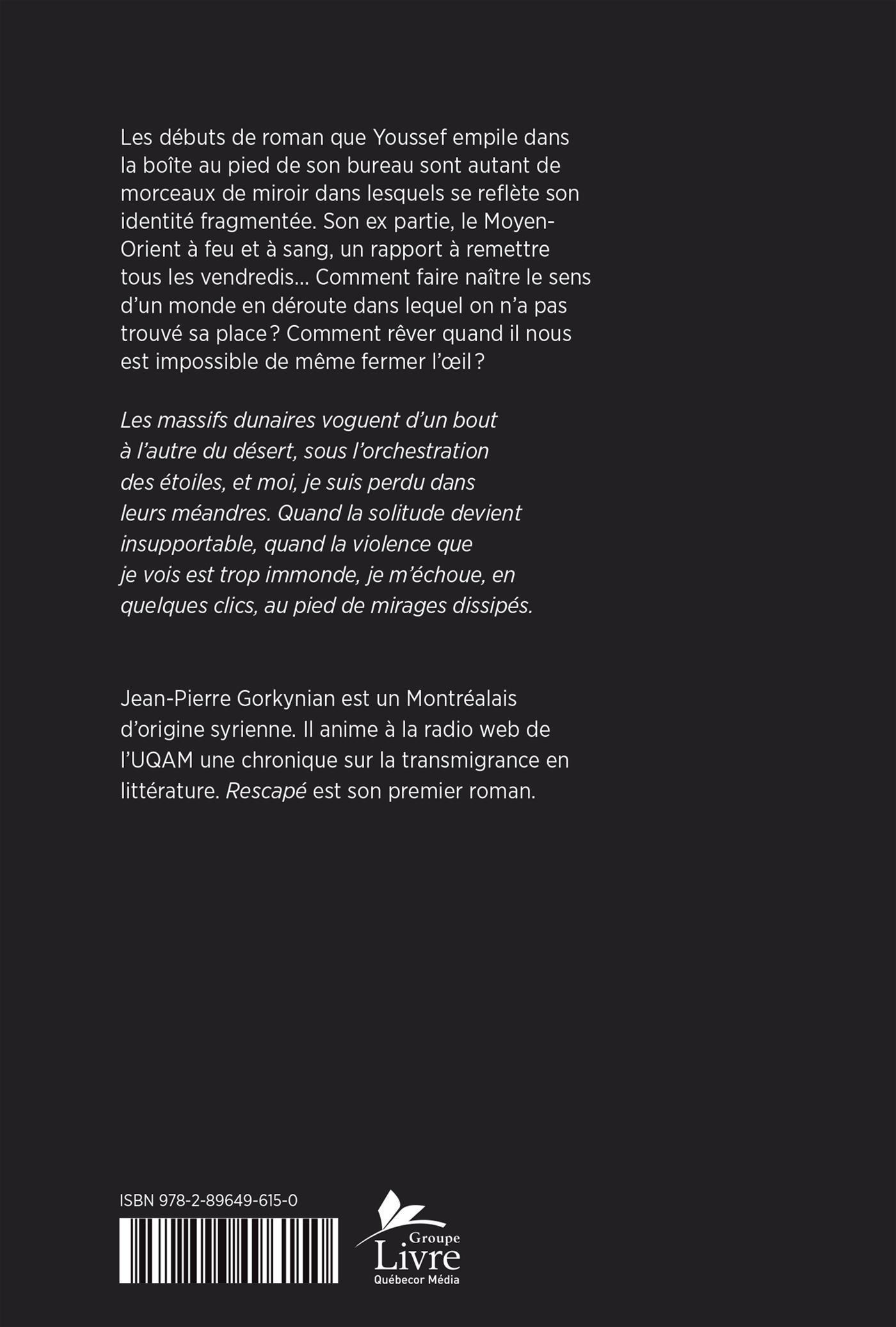 Jean-Pierre Gorkynian est un Montréalais d'origine syrienne. Il anime à la radio web de l'UQAM une chronique sur la transmigrance en littérature. Rescapé est son premier roman.