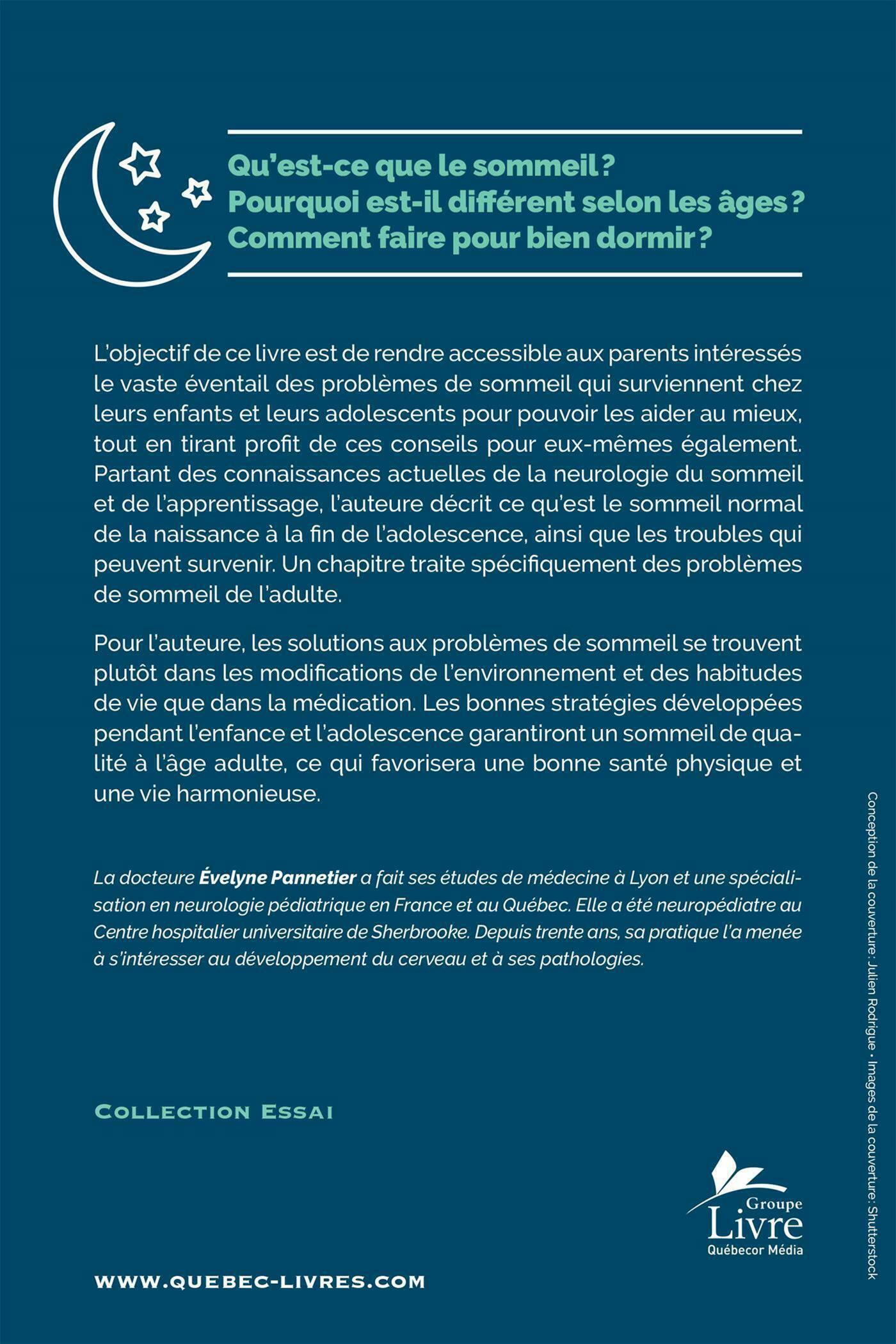 .L'objectif de ce livre est de rendre accessible aux parents intéressés le vaste éventail des problèmes de sommeil qui surviennent chez leurs enfants et leurs adolescents pour pouvoir les aider au mieux, tout en tirant profit de ces conseils pour eux-mêmes également. Partant des connaissances actuelles de la neurologie du sommeil et de l'apprentissage, l'auteure décrit ce qu'est le sommeil normal de la naissance à la fin de l'adolescence, ainsi que les troubles qui peuvent survenir. Un chapitre traite spécifiquement des problèmes de sommeil de l'adulte.