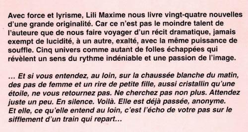 Avec force et lyrisme, Lili Maxime nous livre vigt-quatre nouvelles d'une grande originalité. Car ce n'est pas le moindre talent de l'auteure que de nous faire voyager d'un récit dramatique, jamais exempt de lucidité, à un autre, exalté, avec la même puissance de souffle. Cinq univers comme autant de folles échappées qui révèlent un sens du rythme indéniable et une passion de l'image.