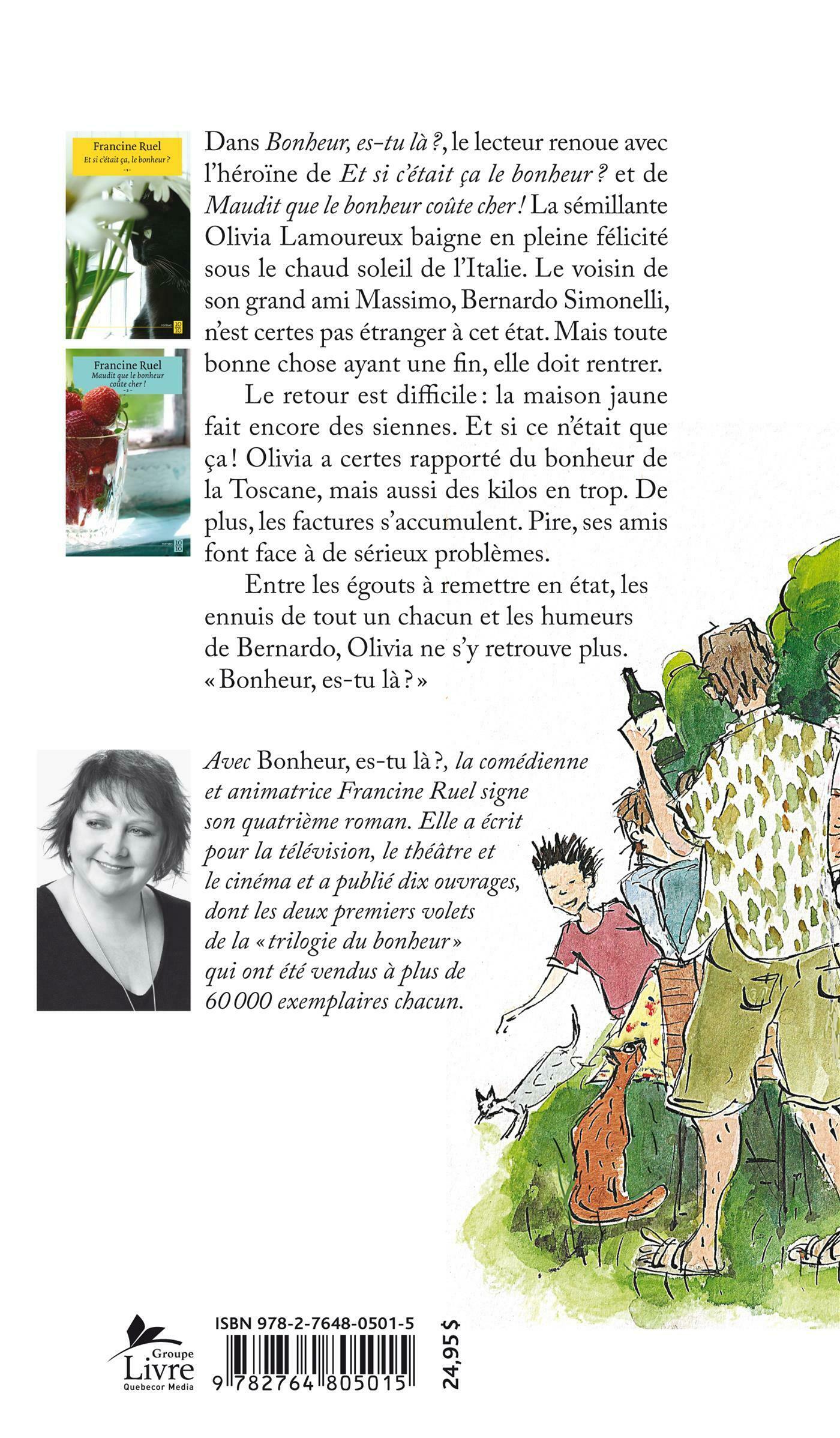 .Et si ce n'était que ça ! Olivia n'a pas rapporté que du bonheur de la Toscane, mais aussi des kilos en trop. Les factures s'accumulent. Son fils nouvellement père n'y arrive pas. Son amie Lulu batifole sur Internet, où elle fait d'inquiétantes rencontres, et le cœur d'Henri a des ratés. François et Albert sont désespérés : Miro, l'enfant qu'ils ont adopté en Chine, ne peut rentrer au pays avec eux. Et pour couronner le tout, Bernardo se montre distant parce qu'elle refuse de tout quitter pour aller vivre avec lui. Olivia ne s'y retrouve plus. « Bonheur, es-tu là ? »