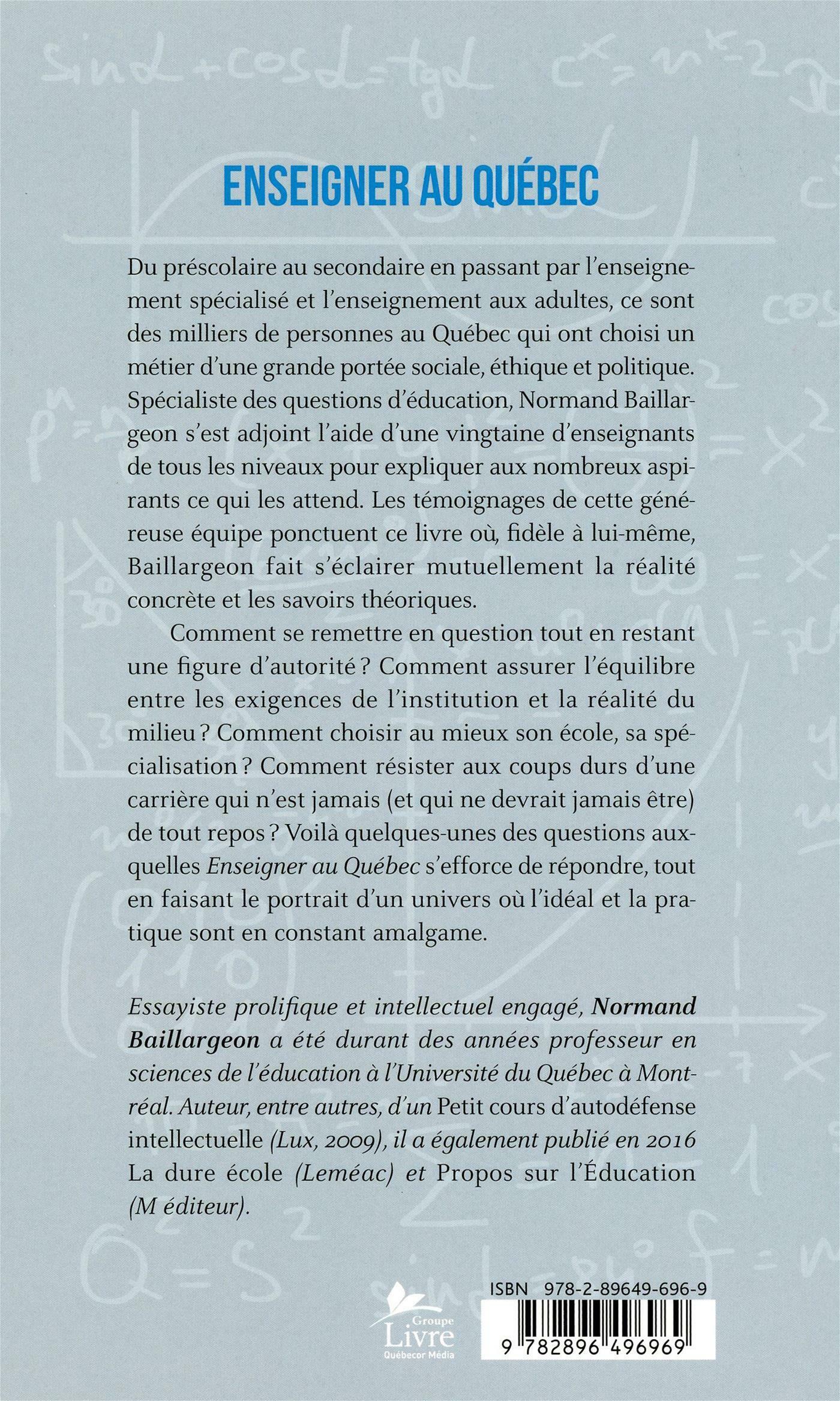 Du préscolaire au secondaire en passant par l'enseignement spécialisé et l'enseignement aux adultes, ce sont des milliers de personnes au Québec qui ont choisi un métier d'une grande portée sociale, éthique et politique. Spécialiste des questions d'éducation, Normand Baillargeon s'est adjoint l'aide d'une vingtaine d'enseignants de tous les niveaux pour expliquer aux nombreux aspirants ce qui les attend. Les témoignages de cette généreuse équipe ponctuent ce livre où, fidèle à lui-même, Baillargeon fait s'éclairer mutuellement la réalité concrète et les savoirs théoriques.