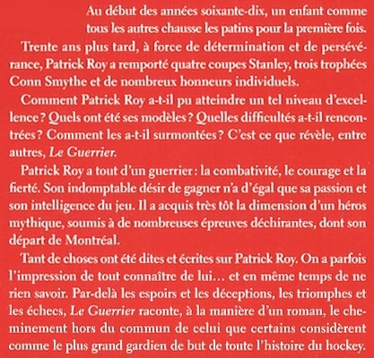 Tant de choses ont été dites et écrites sur Patrick Roy. On a parfois l'impression de tout connaître de lui... et en même temps de ne rien savoir. Par-delà les espoirs et les déceptions, les triomphes et les échecs, Le Guerrier raconte, à la manière d'un roman, le cheminement hors du commun de celui que certains considèrent comme le plus grand gardien de but de toute l'histoire du hockey.
