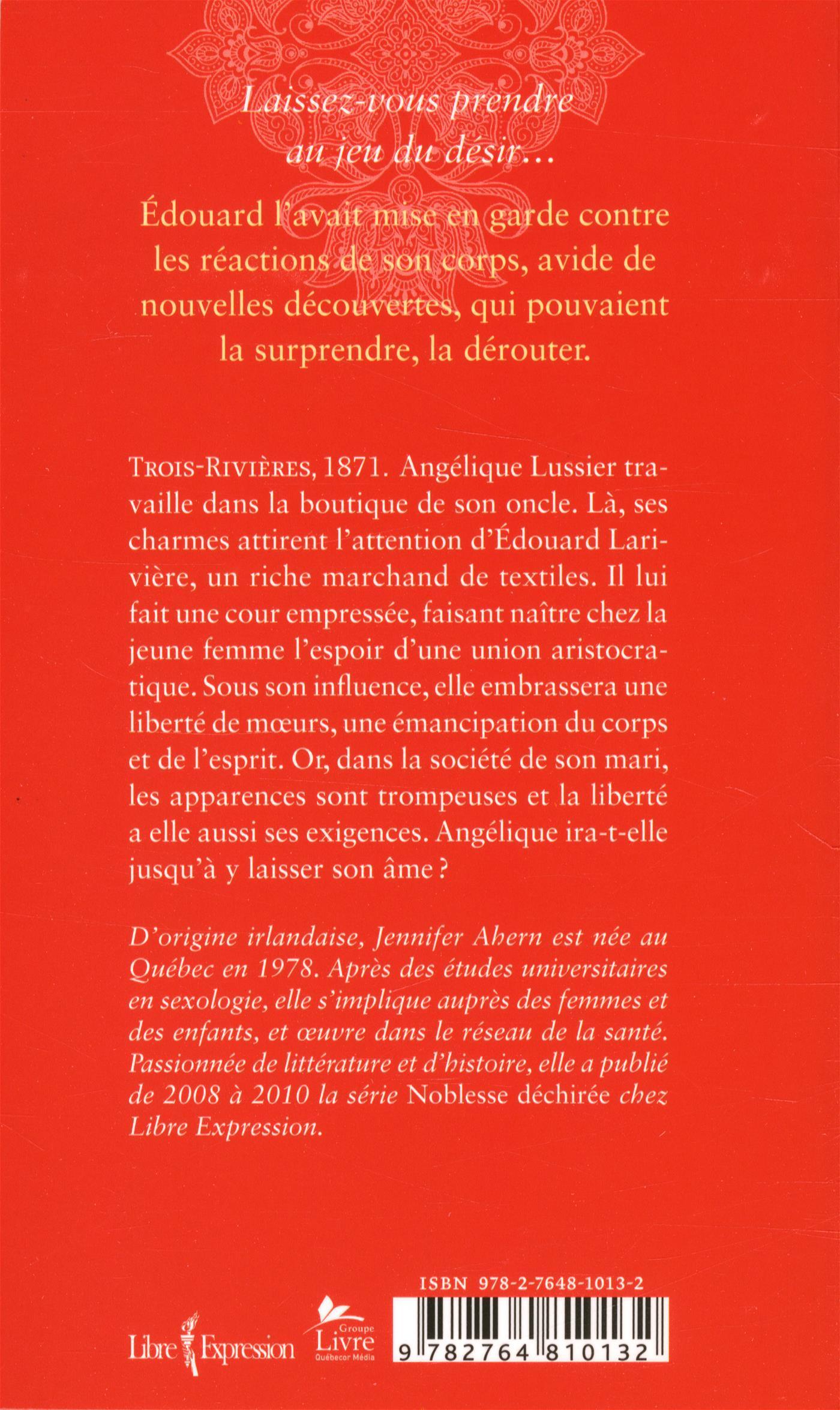 Trois-Rivières, 1871. Angélique Lussier travaille dans la boutique de son oncle. Là, ses charmes attirent l'attention d'Hector Larivière, un riche marchand de textiles. Il lui fait une cour empressée, faisant naître chez la jeune femme l'espoir d'une union aristocratique. Sous son influence, elle embrassera une liberté de mœurs, une émancipation du corps et de l'esprit. Or, dans la société de son mari, les apparences sont trompeuses et la liberté a elle aussi ses exigences. Angélique ira-t-elle jusqu'à y laisser son âme ?