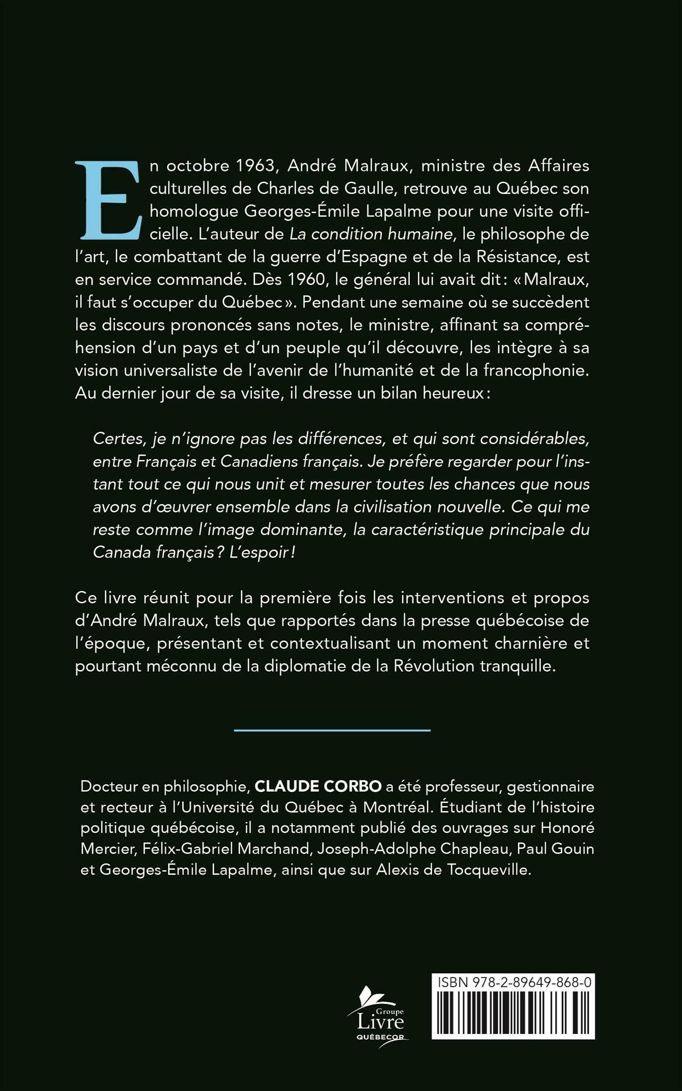En octobre 1963, André Malraux, ministre des Affaires culturelles de Charles de Gaulle, retrouve au Québec son homologue Georges-Émile Lapalme pour une visite officielle. L'auteur de La condition humaine, le philosophe de l'art, le combattant de la guerre d'Espagne et de la Résistance, est en service commandé. Dès 1960, le général lui avait dit : « Malraux, il faut s'occuper du Québec ». Pendant une semaine où se succèdent les discours prononcés sans notes, le ministre, affinant sa compréhension d'un pays et d'un peuple qu'il découvre, les intègre à sa vision universaliste de l'avenir de l'humanité et de la francophonie. Au dernier jour de sa visite, il dresse un bilan heureux :