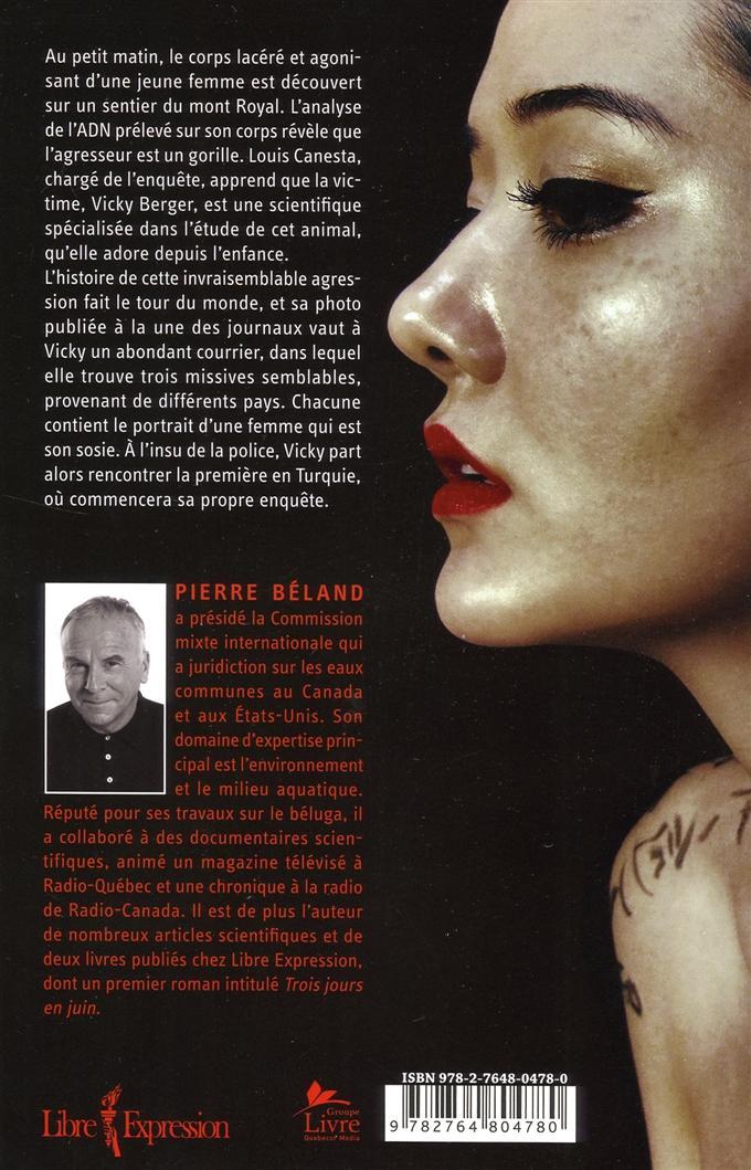 Le corps lacéré et agonisant d'une jeune femme est trouvé au petit matin sur un sentier du mont Royal. L'analyse de l'ADN des prélèvements sur son corps révèle que l'agresseur est un gorille. L'inspecteur Louis Canesta, chargé de l'enquête, apprend que la victime, Vicky Berger, est une scientifique qui étudie cet animal, qu'elle adore depuis l'enfance. La jeune femme demeure dans le coma pendant plusieurs jours. Sa photo et l'histoire de cette invraisemblable agression font le tour du monde et lui valent un abondant courrier. À son réveil, elle révèle à l'inspecteur Canesta qu'elle a vu, avant de perdre conscience, une image floue du buste de son agresseur, sur lequel se profilaient quatre lettres : B, R, N et O. On apprendra qu'il s'agit de l'acronyme d'un groupe extrémiste qui s'oppose à toute manipulation génétique. Ce groupe a pris ses racines dans la ville de Brno, lieu de naissance de l'Église moravienne, qui a aujourd'hui des missions à travers le monde, dont une au Labrador. Parmi les lettres qu'elle a reçues, Vicky trouve plusieurs missives semblables, provenant de différents pays. Chacune contient la photo d'une personne qui est son sosie. Elles sont onze en tout. La jeune femme part rencontrer la première en Turquie, où elle commencera sa propre enquête, à l'insu de la police.