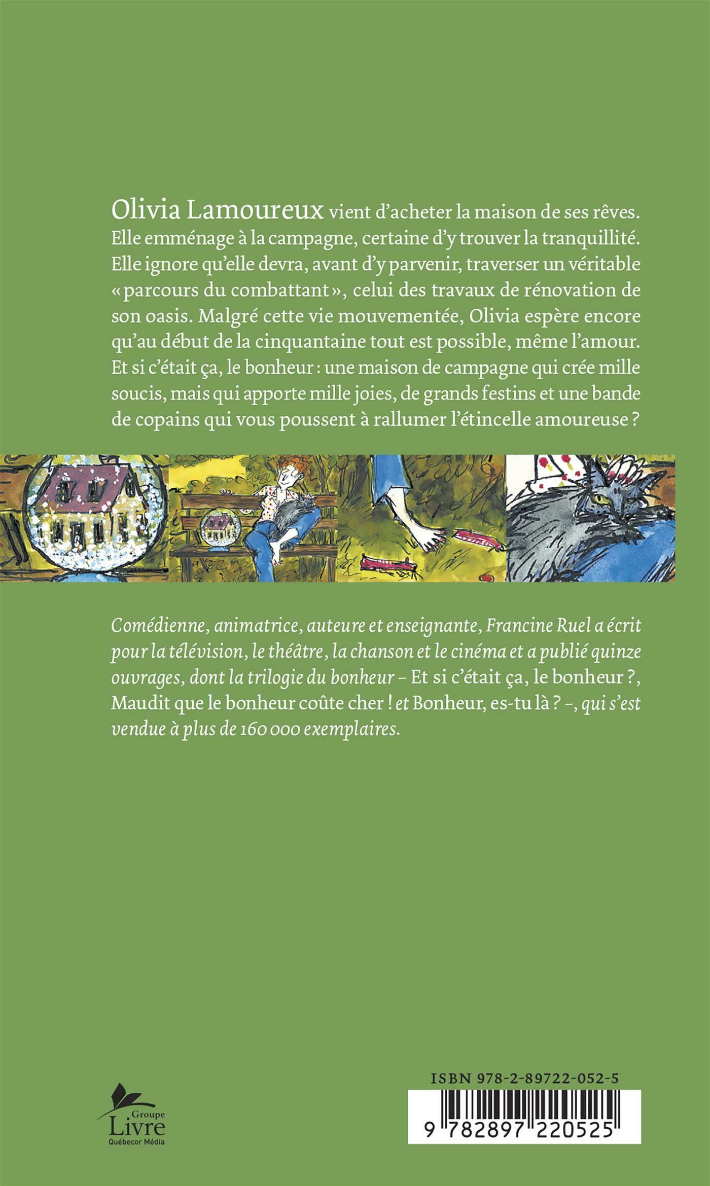 Olivia Lamoureux vient d'acheter la maison de ses rêves. Elle emménage à la campagne, certaine d'y trouver la tranquillité. Elle ignore qu'elle devra, avant d'y parvenir, traverser un véritable «parcours du combattant», celui des travaux de rénovation de son havre de paix. Malgré cette vie mouvementée, Olivia espère encore qu'en début cinquantaine tout est possible, même l'amour. Et si c'était ça le bonheur: une maison de campagne qui crée mille soucis, mais qui apporte mille joies, de grands festins et une bande de copains qui vous poussent à rallumer l'étincelle amoureuse.
