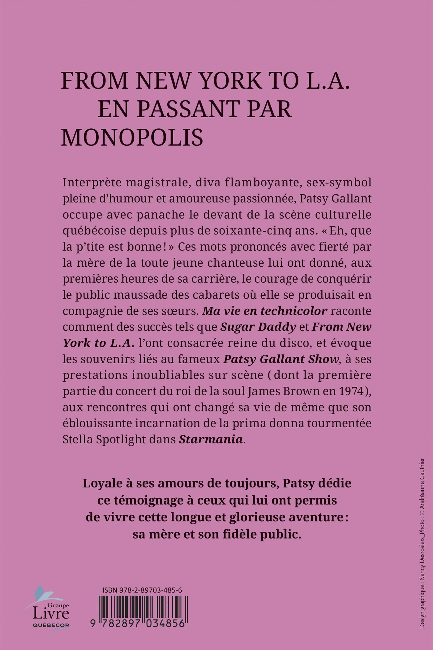 Ma vie en technicolor raconte comment des succès tels que Sugar Daddy et From New York to L.A. l'ont consacrée reine du disco, et évoque les souvenirs liés au fameux Patsy Gallant Show, à ses prestations inoubliables sur scène (dont la première partie du concert du roi de la soul James Brown en 1974), aux rencontres qui ont changé sa vie de même que son éblouissante incarnation de la prima donna tourmentée Stella Spotlight dans Starmania.