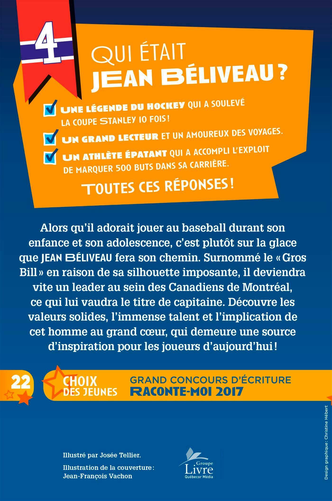 Qui était Jean Béliveau? .- Une légende du hockey qui a soulevé la coupe Stanley 10 fois! .- Un grand lecteur et un amoureux des voyages. .- Un athlète épatant qui a accompli l'exploit de marquer 500 buts dans sa carrière. . .Toutes ces réponses! . .Alors qu'il adorait jouer au baseball durant son enfance et son adolescence, c'est plutôt sur la glace que Jean Béliveau fera son chemin. Surnommé le «Gros Bill» en raison de sa silhouette imposante, il deviendra vite un leader au sein des Canadiens de Montréal, ce qui lui vaudra le titre de capitaine. . .Découvre les valeurs solides, l'immense talent et l'implication de cet homme au grand cœur, qui demeure une source d'inspiration pour les joueurs d'aujourd'hui!