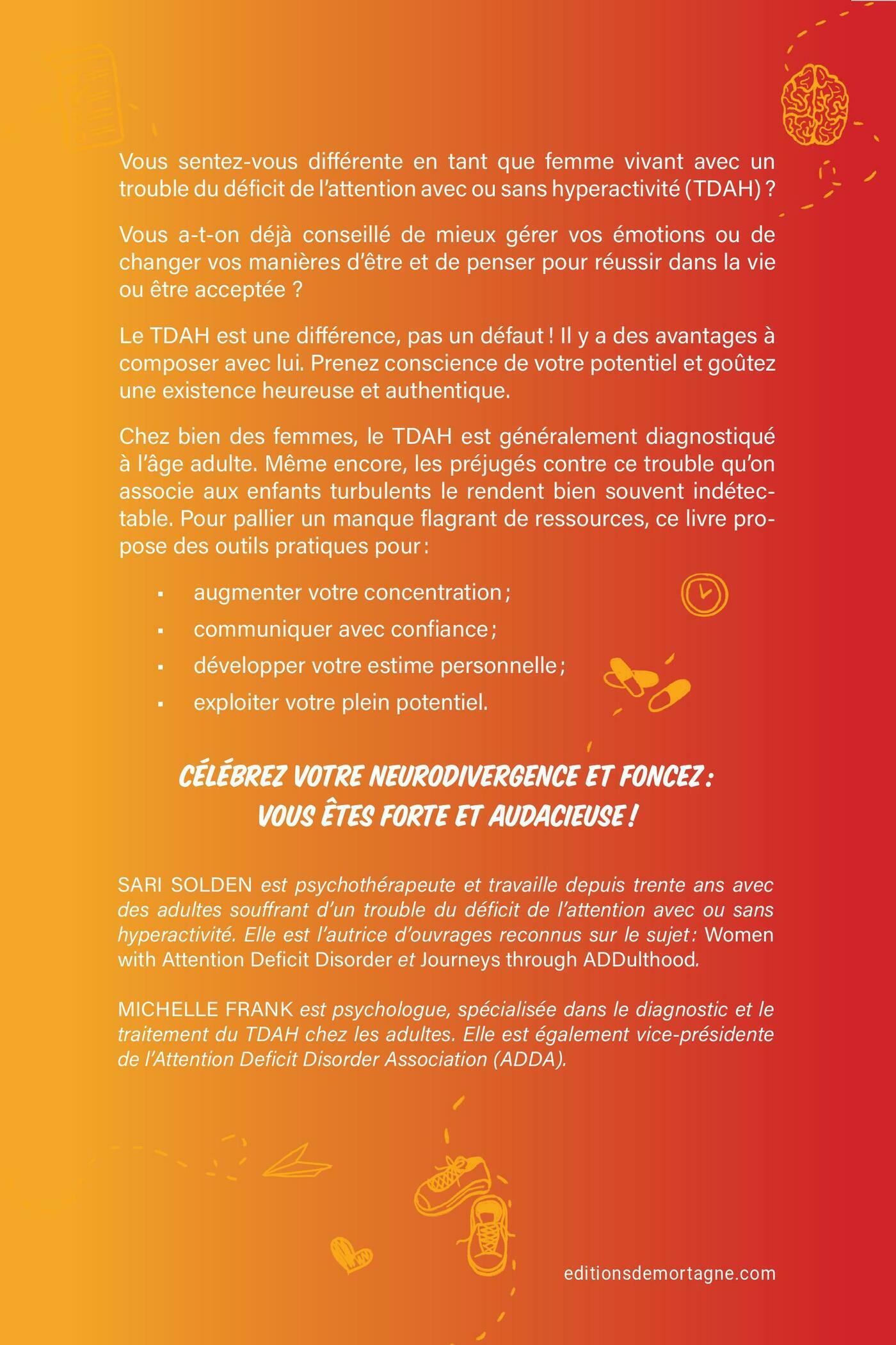 Vous sentez-vous différente en tant que femme vivant avec un trouble du déficit de l’attention avec ou sans hyperactivité (TDAH) ?Vous a-t-on déjà conseillé de mieux gérer vos émotions ou de changer vos manières d'être et de penser pour mieux réussir dans la vie ou être acceptée ?Le TDAH est une différence, pas un défaut ! Il y a des avantages à composer avec lui. Prenez conscience de votre potentiel et goûtez à une existence heureuse et authentique.Chez bien des femmes, le TDAH est généralement diagnostiqué à l’âge adulte. Même encore, les préjugés contre ce trouble qu’on associe aux enfants turbulents le rendent bien souvent indétectable. Pour pallier un manque flagrant de ressources, ce livre propose des outils pratiques pour :• augmenter votre concentration ;• communiquer avec confiance ;• développer votre estime personnelle ;• exploiter votre plein potentiel.Célébrez votre neurodivergence et foncez : vous êtes forte et audacieuse !