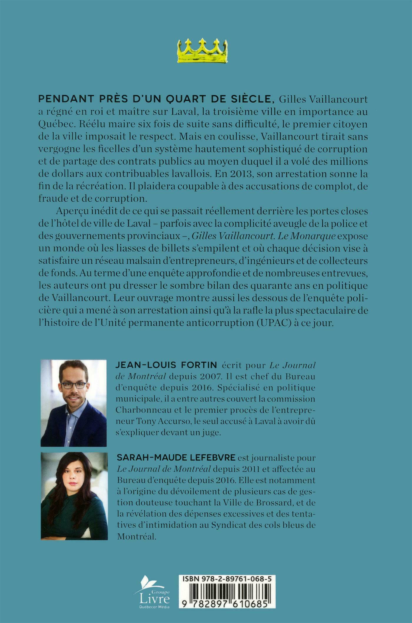..Aperçu inédit de ce qui se passait réellement derrière les portes closes de l'hôtel de ville de Laval — parfois avec la complicité aveugle de la police et des gouvernements provinciaux —, Gilles Vaillancourt. Le Monarque expose un monde où les liasses de billets s'empilent et où chaque décision vise à satisfaire un réseau malsain d'entrepreneurs, d'ingénieurs et de collecteurs de fonds. Au terme d'une enquête approfondie et de nombreuses entrevues, les auteurs ont pu dresser le sombre bilan des quarante ans en politique de Vaillancourt. Leur ouvrage montre aussi les dessous de l'enquête policière qui a mené à son arrestation ainsi qu'à la rafle la plus spectaculaire de l'histoire de l'Unité permanente anticorruption (UPAC) à ce jour.