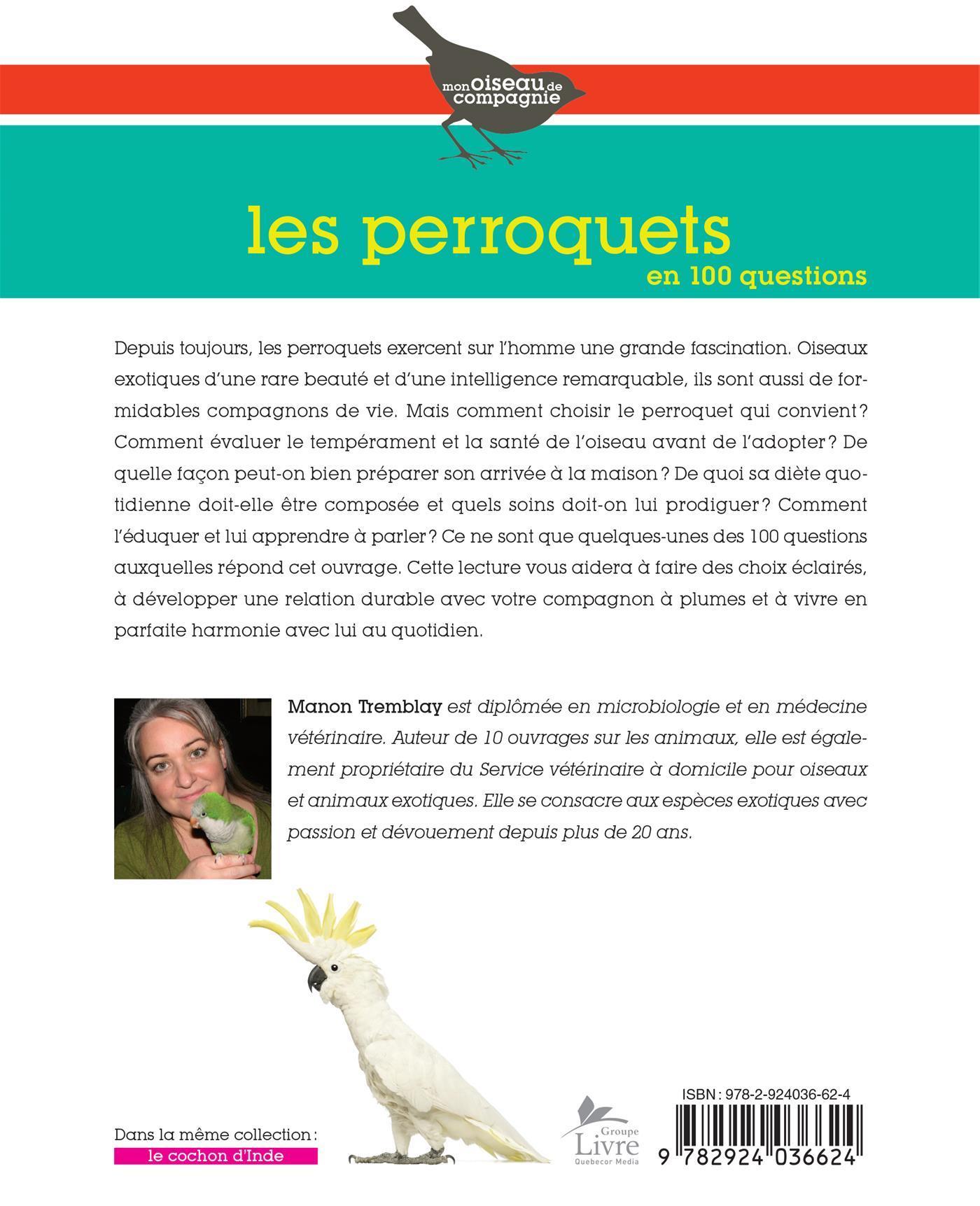 Depuis toujours, les perroquets exercent sur l'homme une grande fascination. Oiseaux exotiques d'une rare beauté et d'une intelligence remarquable, ils sont aussi de formidables compagnons de vie. Mais comment choisir le perroquet qui convient? Comment évaluer le tempérament et la santé de l'oiseau avant de l'adopter? De quelle façon peut-on bien préparer son arrivée à la maison? De quoi sa diète quotidienne doit-elle être composée et quels soins doit-on lui prodiguer? Comment l'éduquer et lui apprendre à parler? Ce ne sont que quelques-unes des 100 questions auxquelles répond cet ouvrage. Cette lecture vous aidera à faire des choix éclairés, à développer une relation durable avec votre compagnon à plumes et à vivre en parfaite harmonie avec lui au quotidien.